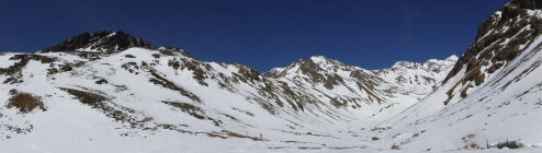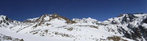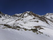 Tourenbeginn um 07:50 Uhr bei -6°C unter klarem Himmel und kaltem Südföhn. Der Güterweg zur Matscher Kuhalm war stellenweise schon schneefrei und stark vereist. Ich schnallte die Schneeschuhe erst nach ca. 20 min. an. Schnee war stark verharscht. Erst ab ca. 2500 m gab es Pulver unter nicht tragendem Deckel. Ich musste alles spuren. Es gab lediglich 2 alte, kaum noch sichtbare Ski-Abfahrt-Spuren vom Matscher Jochsee hinab. Die Südostflanke im mittleren Bereich und der Gipfelgrat waren stellenweise schneefrei.