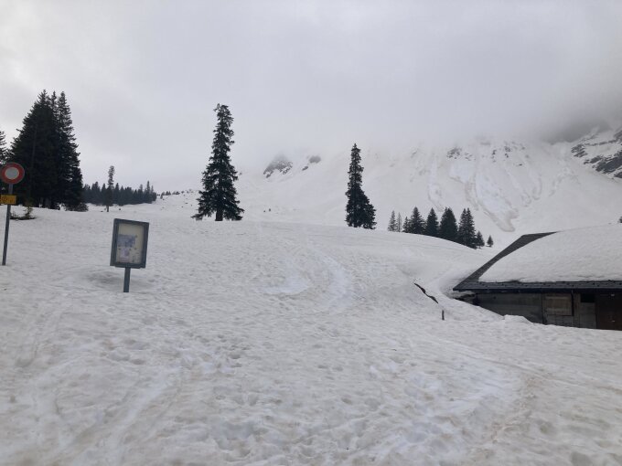 Beim Aufstieg im untersten Bereich (bis zirka 1'800m) schwerer Nass-Schnee, der über Nacht nicht gefror. (Zwischendurch sinkt man auf Schneeschuhen unvermittelt 50cm in den Schnee...)