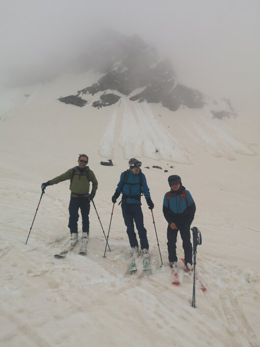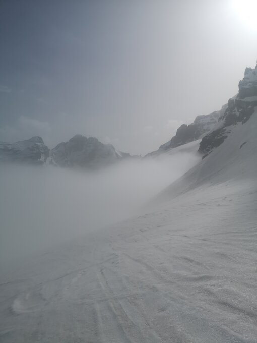Nebel bis 2'300 müM. Nassschnee bis oben. Routenfindung anspruchvoll da keine Sicht. Es hatte relativ viele, auch grössere Nassschneerutsche, die im steileren Gelände ab 35 Grad auch nordseits bereits am Vormittag leicht auslösbar waren. Strasse Tschingel-Griesalp nicht mehr fahrbar.