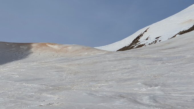 Abfahrt kurz nach 11:00 war perfekt, Wischbäch mit schönem Sulz, trotz Saharastaub sehr gut zu fahren. Grosser Nassschneelawinenzug wahrscheinlich von gestern vom Schwarzhoren runter, rechte Abfahrtsvariante deshalb aktuell nicht sinnvoll.