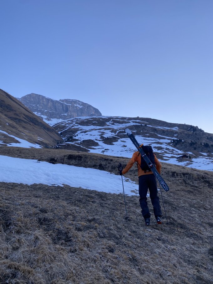 Ab Cresta ca. 300 Höhenmeter auf Wiese und harten Schnee Ski getragen.