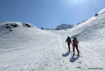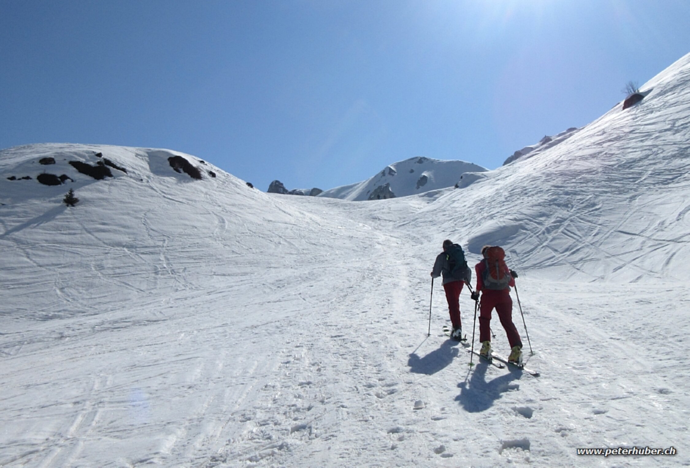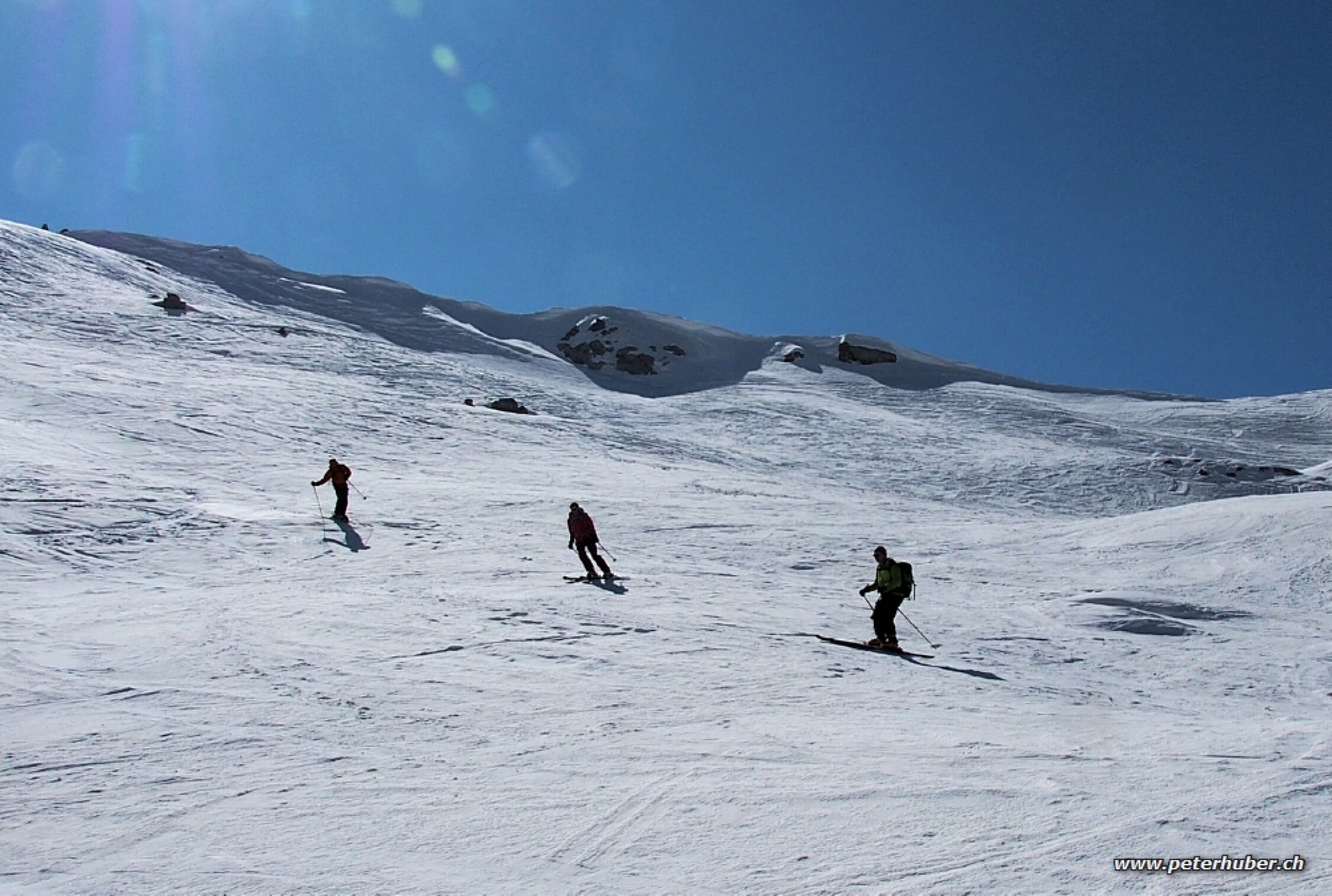 Abfahrt um 12:30: Der Schnee war noch gar nicht aufgetaut. So blieb es ruppig in den alten Spuren. (dafür gäbe es nur ein MACHBAR) Erst unterhalb 1800 m sind einzelne, sonnige Hänge etwas aufgetaut. (Flinti, im vorigen Eintrag muss da wohl sehr sonnige Stellen erwischt haben)