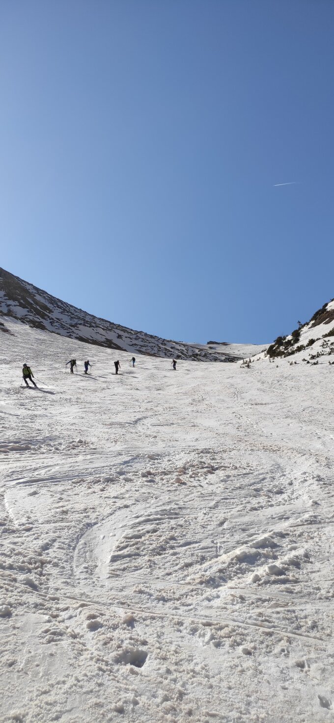 Schnee vom Parkplatz, ab 13h weicher, z.T. schöner Firn.