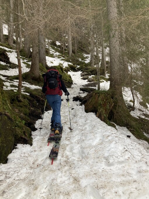 Start am Parkplatz um 8 Uhr. Tragend gefroren. Einige Tragestellen im Wald (Sommerweg) und griffiger Firn. Im Hang zum Nüwe Berg jede Menge Lawinenschnee - hier hat es aber noch Platz für Spuren. Als wir heute um ca 12:30 Uhr runter sind, super Frühlingssulz.