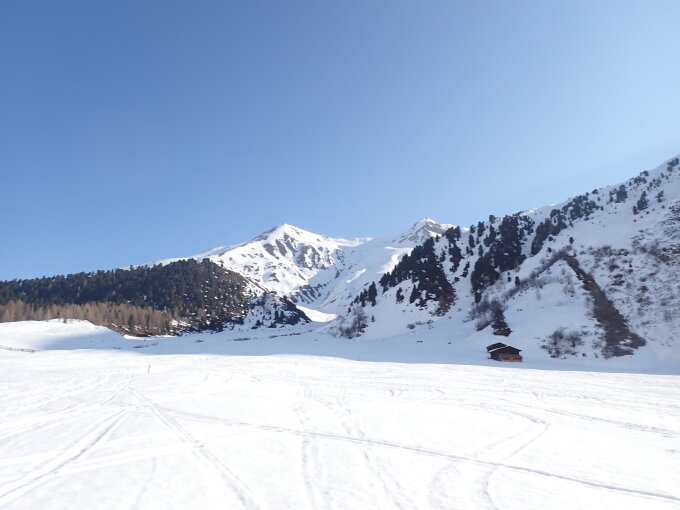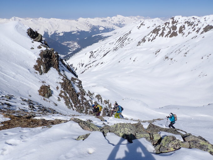 Start in Sertig um 8:45 Uhr bei -6°. Tragend gefroren. Es ist möglich, ohne Harscheisen zum Sattel aufzusteigen, wir haben sie für ein kurzes Stück bis auf ca. 2200 m benutzt. Abstieg um 12:00 von 2 Couloirs östlich des Sattels nach Uf den Gfrornen, auf schönem Sulz. Dann Nassschnee bis Sand.
