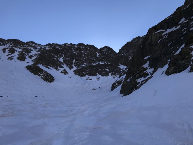 Erste Engstelle am Bach sehr hart, sicheres Harsteisengehen zwingend notwendig. Zweite Steilstufe ebenfalls hart, aber gut zu gehen. Gipfel problemlos zu Fuss.