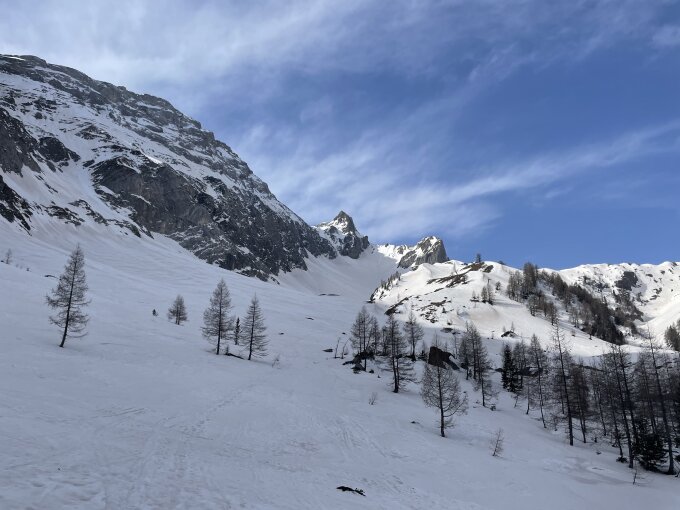Im Aufstieg überall harter Schnee, teils etwas rutschig, aber alles ohne Harscheisen machbar.