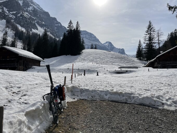 Mit dem Velo über die geräumte Strasse bis Iffigenalp, nur im Bereich Ritzdole etwas vereist.