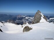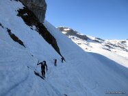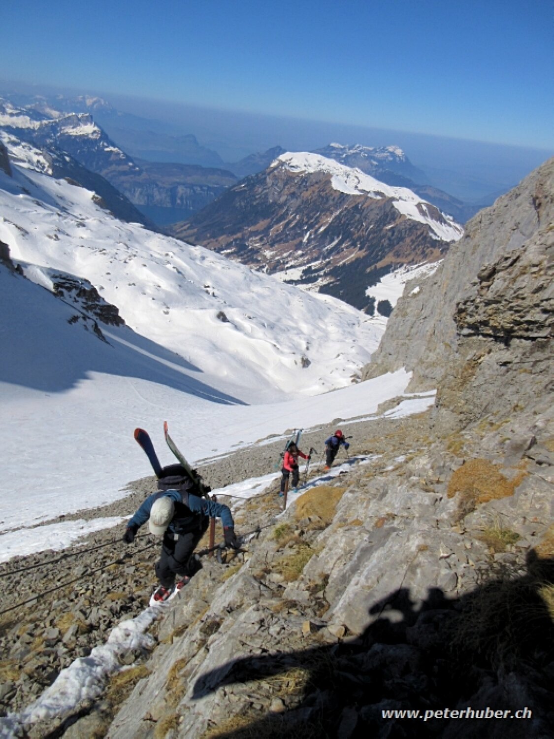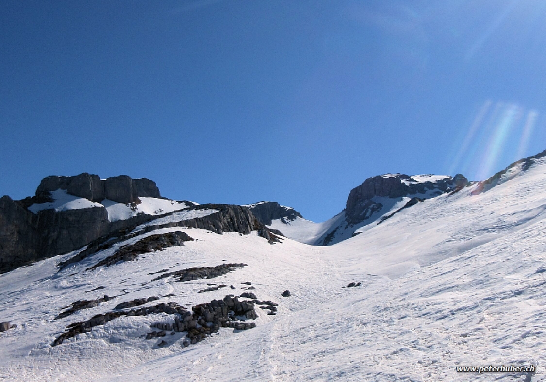 Morgens war der Schnee hart gefroren. Die vorhandene Spur stellenweise etwas rutschig. Ab Passage Schnürstock haben wir Harscheisen montiert. Es lohnt sich an etlichen Stellen. Fussaufstieg zum Gipfel fast schneefrei. Es hat nur noch ganz wenige eisige Stellen. Um 12 Uhr leicht aufgeweicht.