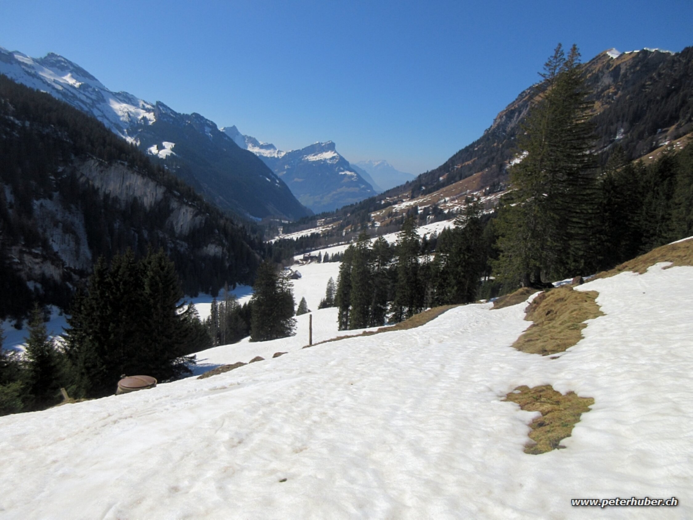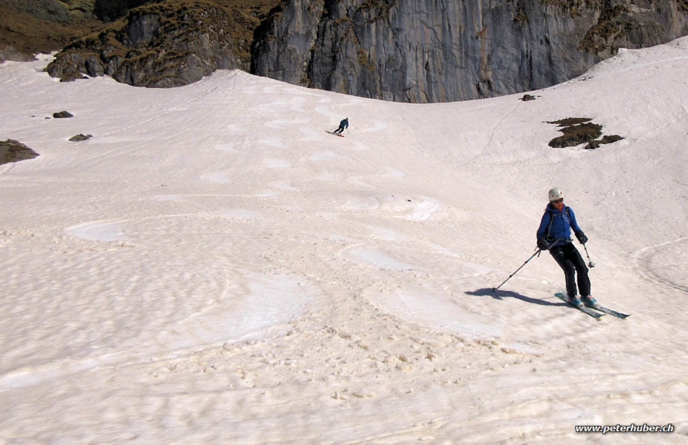 Abfahrt nach 12 Uhr: Erste Hänge bis Rupperslauibödeli hart, aber griffig. Nur wenige alte Spuren drin. Dann einige schöne, sulzige Hänge bis nach Alpeli hinunter. Von da bis zur Brücke bei P1428 wieder recht hart gefroren. Da hats dann mehr alte Spuren drin.