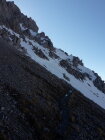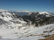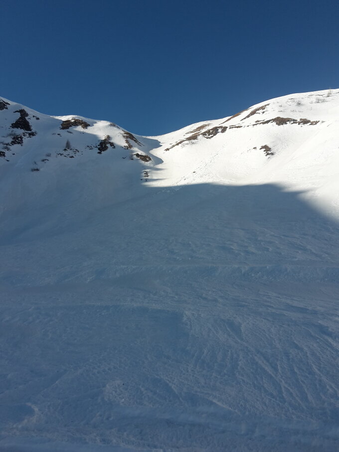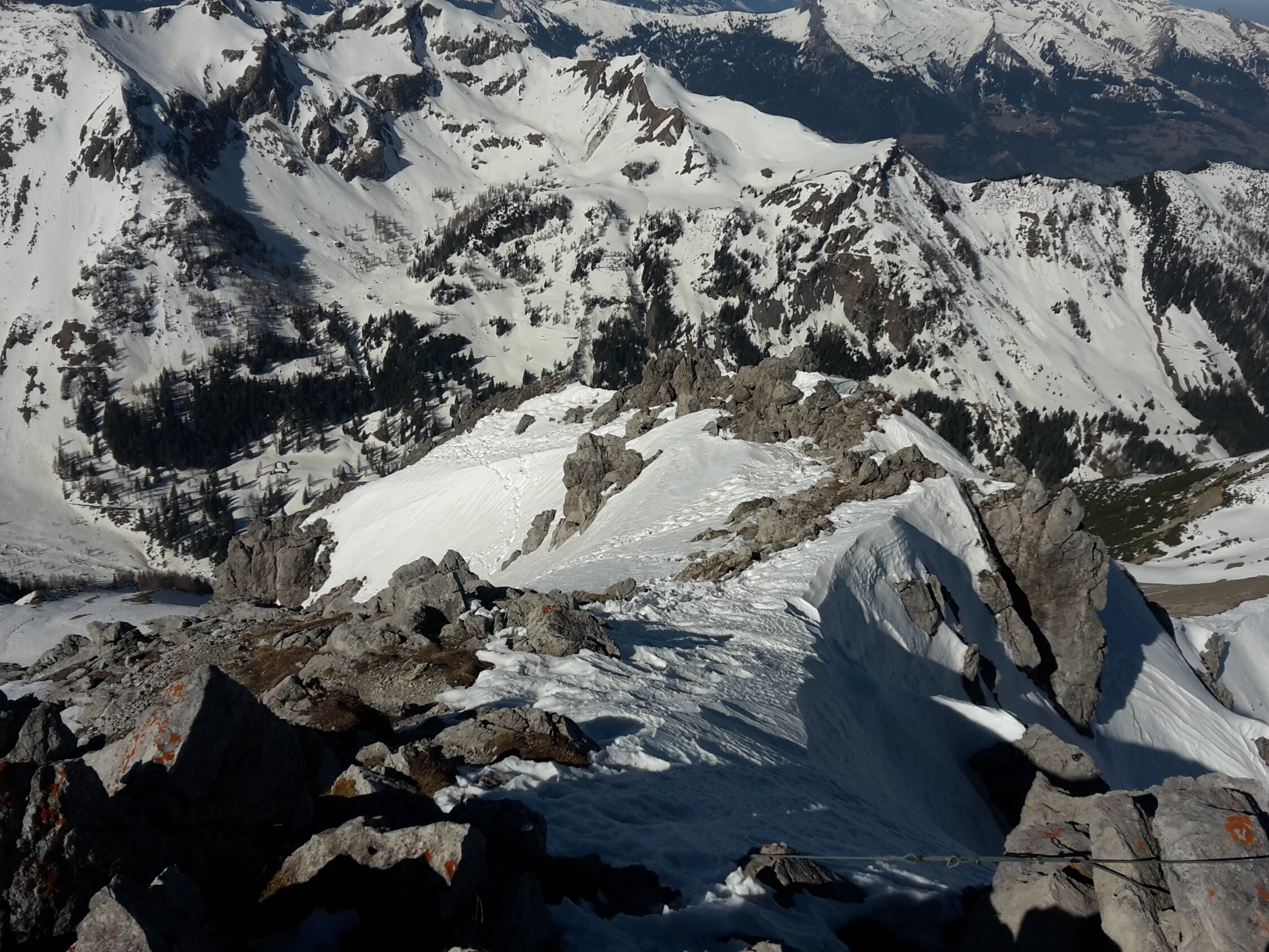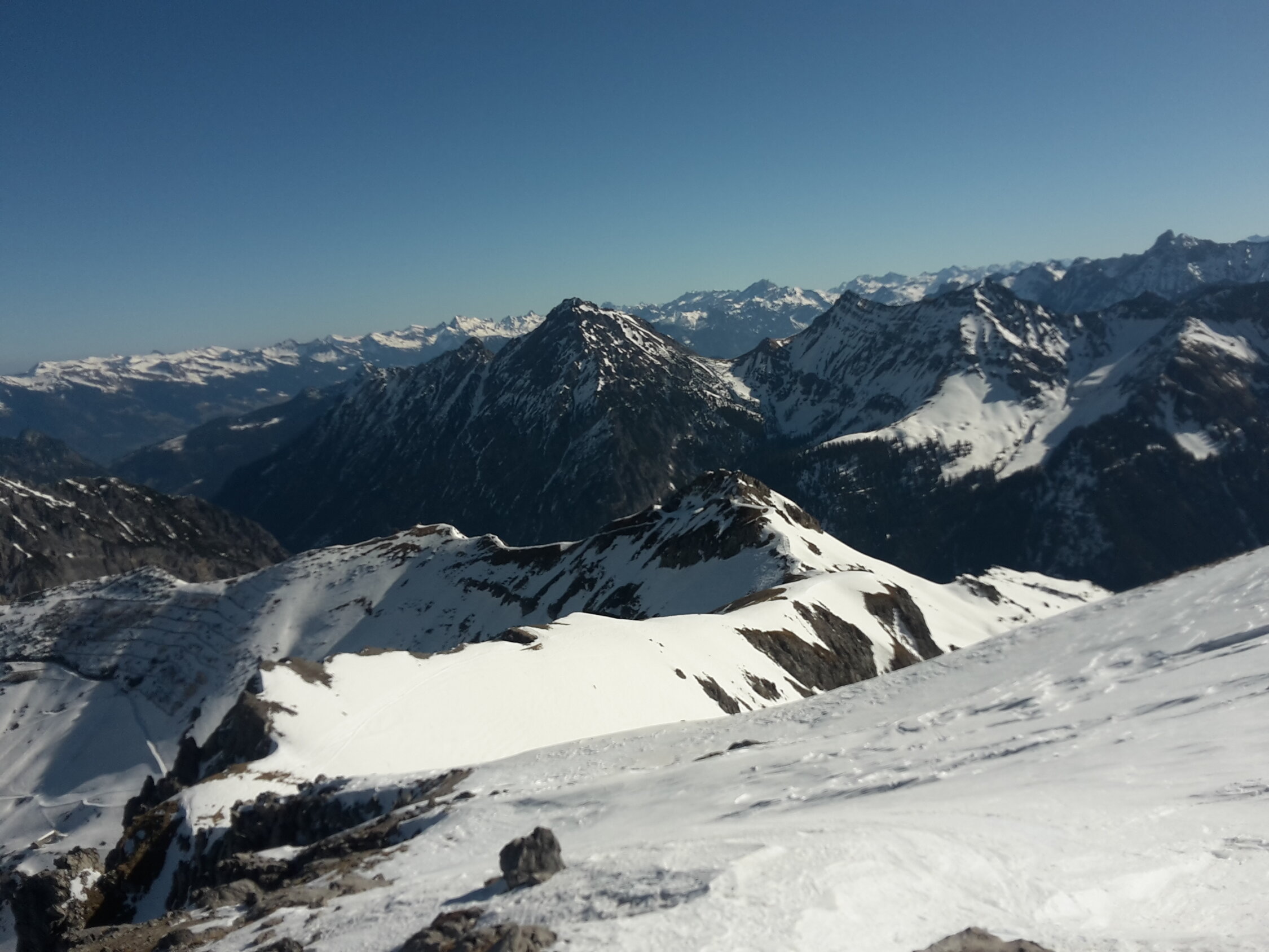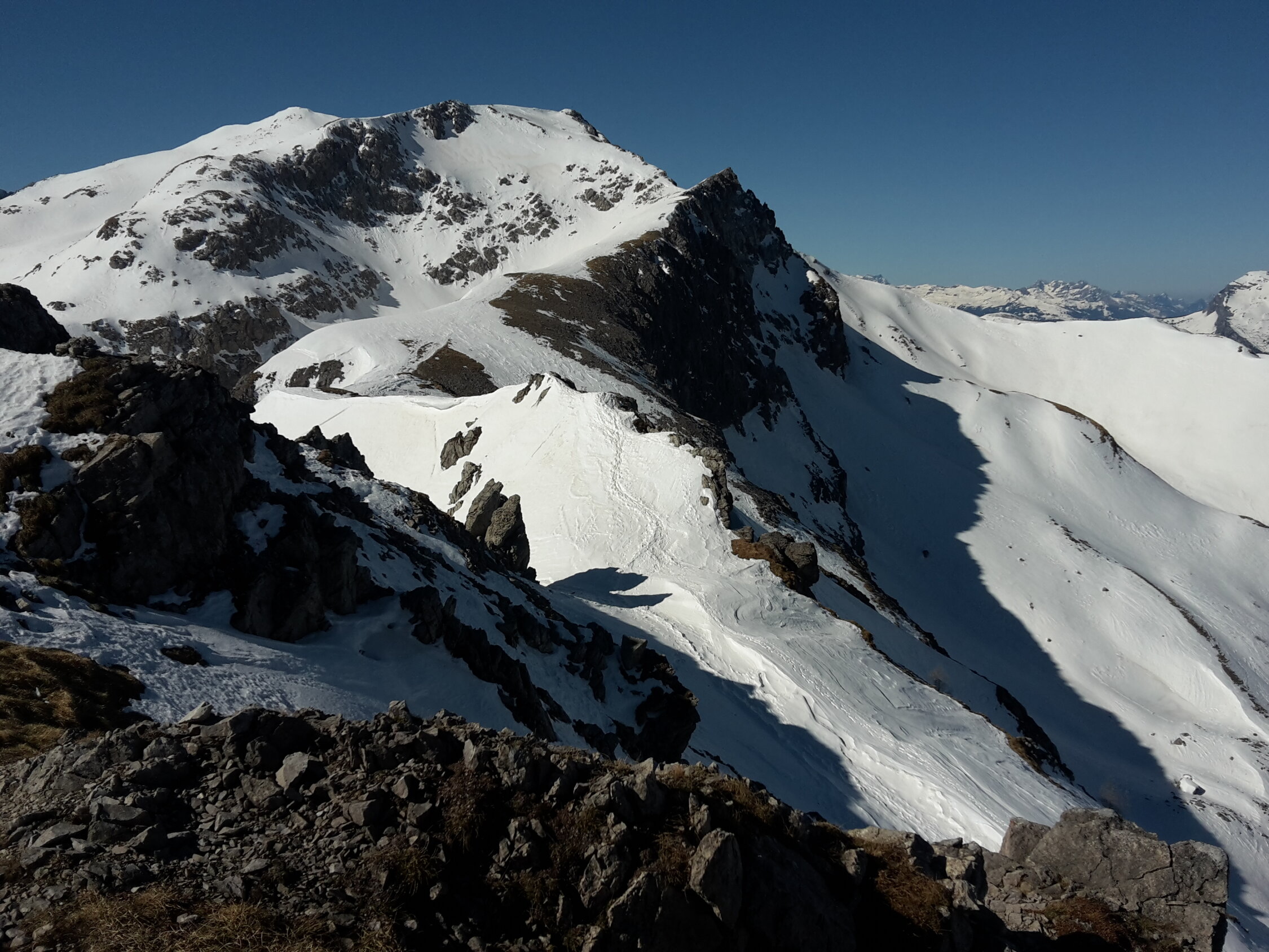 Start um 7:55 in Malbun, hurtig die Piste hoch ins Vadozer Tälli, alles hart. Unter der Rinne, die hoch zur Tälihöhi führt, auf ca. 1960m Wechsel auf Steigeisen (man könnte es auch mit Harscheisen entlang dem Wanderweg erzwingen): alles hart und tragend, Ausstiegswächte klein. Achtung: nur bei SICHEREN Verhältnissen!! Weiter mit Steigeisen dem meist aperen Grat entlang zum Silberhorn/Hubel (man könnte es auch hier weit hinauf mit Ski auf der verwächteten Seite des Grates erzwingen, nix für yours truly). Weiter auf dem Grat bis zur Querung westlich unter dem Gipfel, Schlüsselstelle "ums Eck" an einer Stelle etwas abdrängend gespurt (v.a. mit aufgeschnallten Skiern), also Obacht. Halde zum Gipfel teils aper, yours truly hat die steigeisenschonende Schneeroute gewählt. Abfahrt vom Gipfel über Löffel bis Mattelti (tiefster Punkt auf dem Grat): hart und holperig aber doch recht griffig und technisch unschwierig. Wieder Wechsel auf Steigeisen und zu Fuss den Fürstin-Gina-Weg entlang zum Kreuz auf dem Grat von Sareis (und im Vorbeigehen noch hurtig den Spitz mitgenommen). Vom Kreuz Direktabfahrt zur Piste von Sareis: hart aber griffig. Auf der Piste zurück nach Malbun. Wer lange Abfahrten sucht, ist hier falsch, das Ganze hat mehr den Charakter einer kurzweiligen "Hinterhof"-Tour mit Hochtouren-Flair, die schnell mit ÖV zu erreichen ist ;-) Auf der ganzen Route niemanden angetroffen.