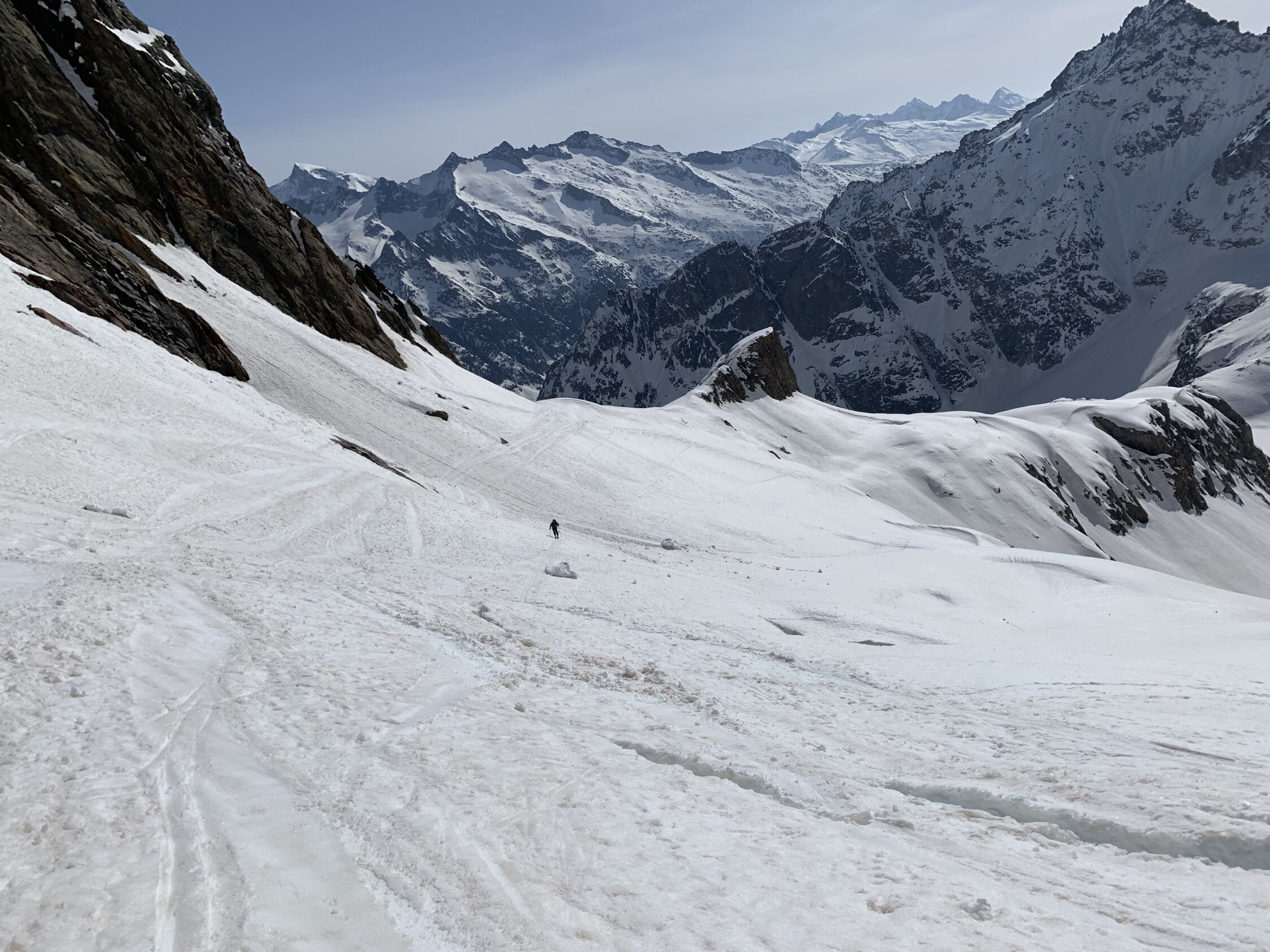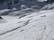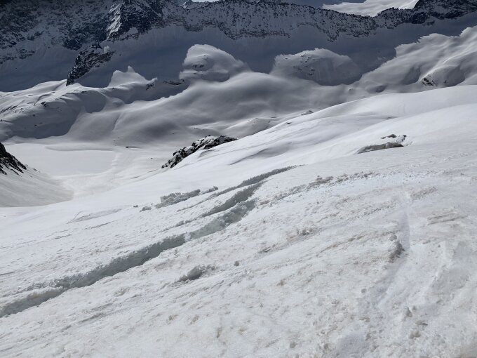 Im Aufstieg alles hart und tragend. Meist aber griffig. Harscheisen nur in den steilen Abschnitten zwingend. Gleitschneerisse im Übergang zum Golegggletscher (Bild).
