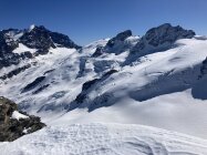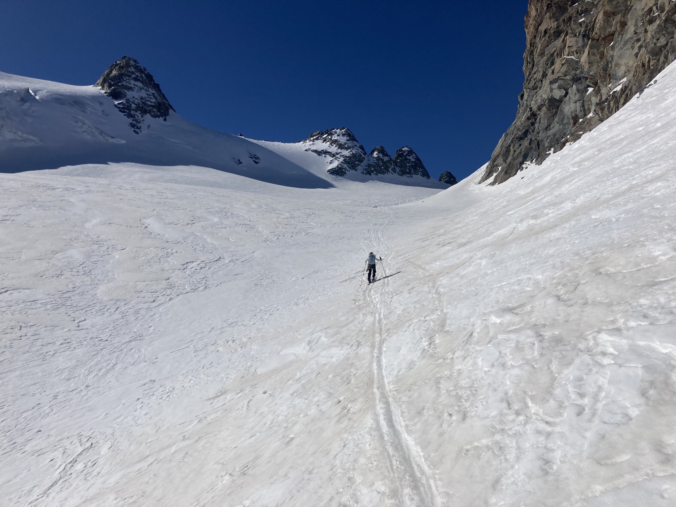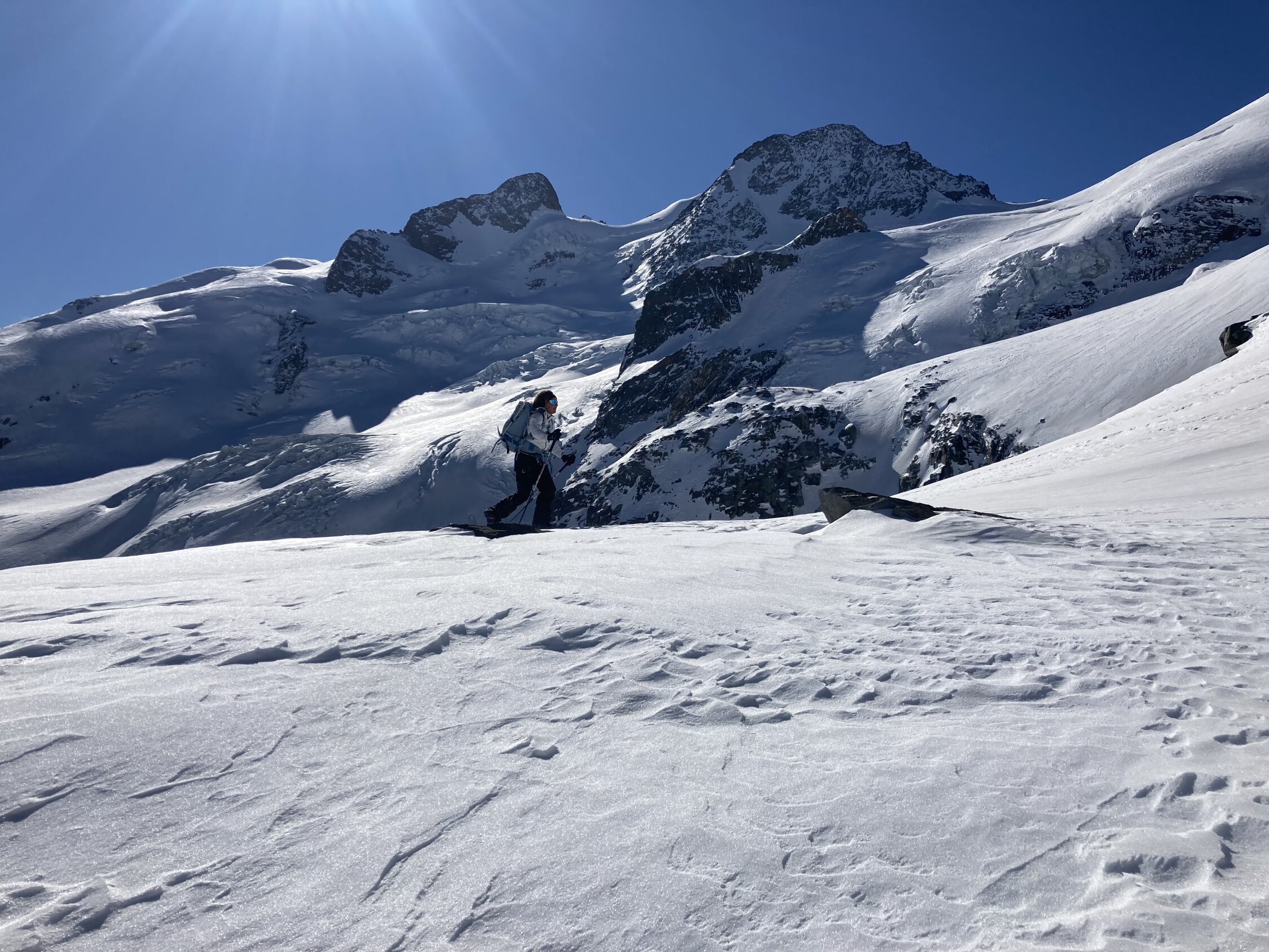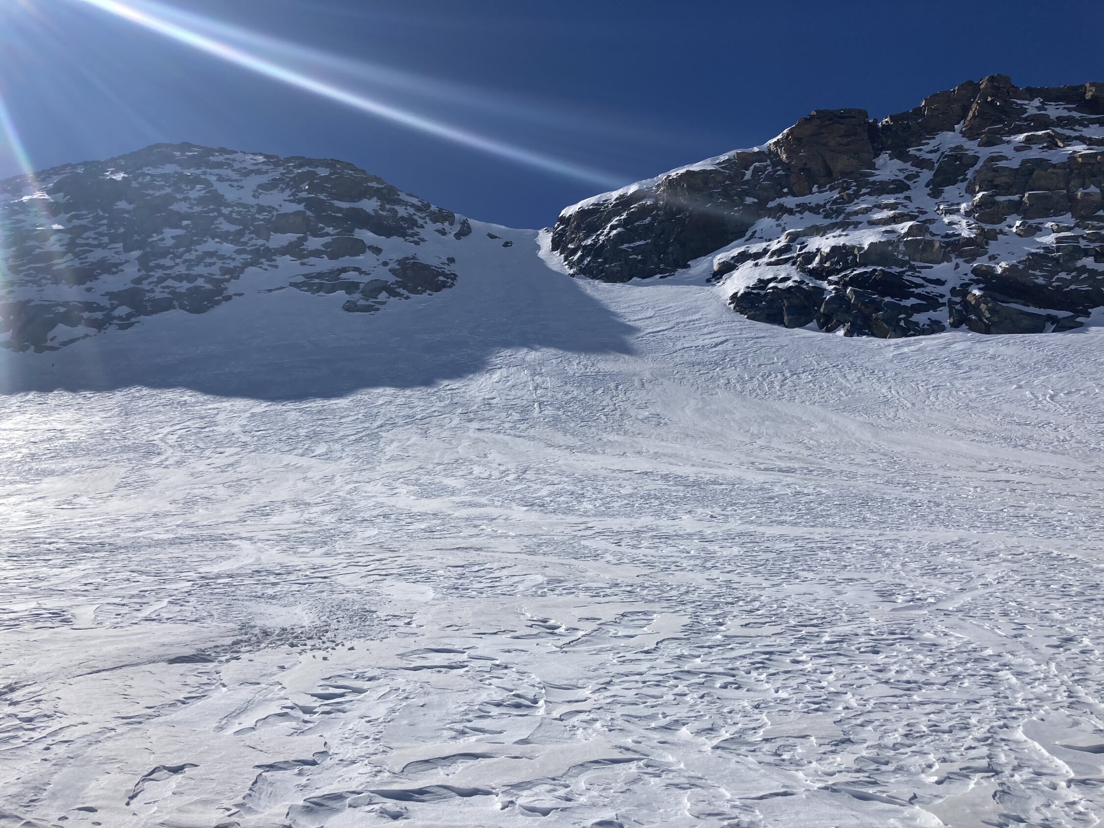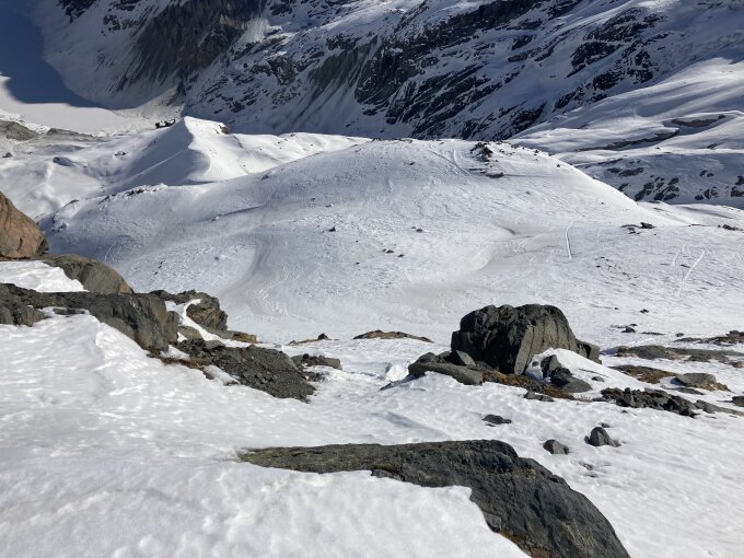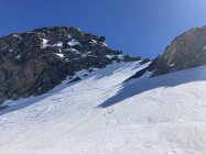 als Zugang zum oberen SW-Grat von der Chamanna Coaz haben wir ein S-Couloir gewählt; hier hat es sehr gute Verhältnisse für den Fussaufstieg. Das Couloir ist ca. 50° steil. In der Abfahrt direkt vom Skidepot Normalweg hatte es ein bisschen von allem Pulver, Windharsch, Sulz. Ging tiptop zum fahren.