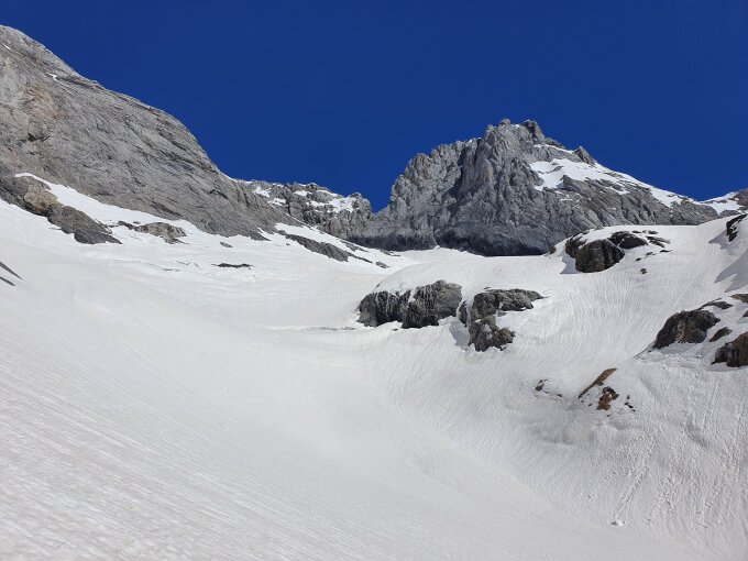 Beide Bergschrunde (erster bei ca. P2500; siehe Bild und zweiter beim ersten Skidepot bei ca. P2854) sind noch sehr gut eingeschneit.