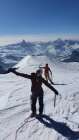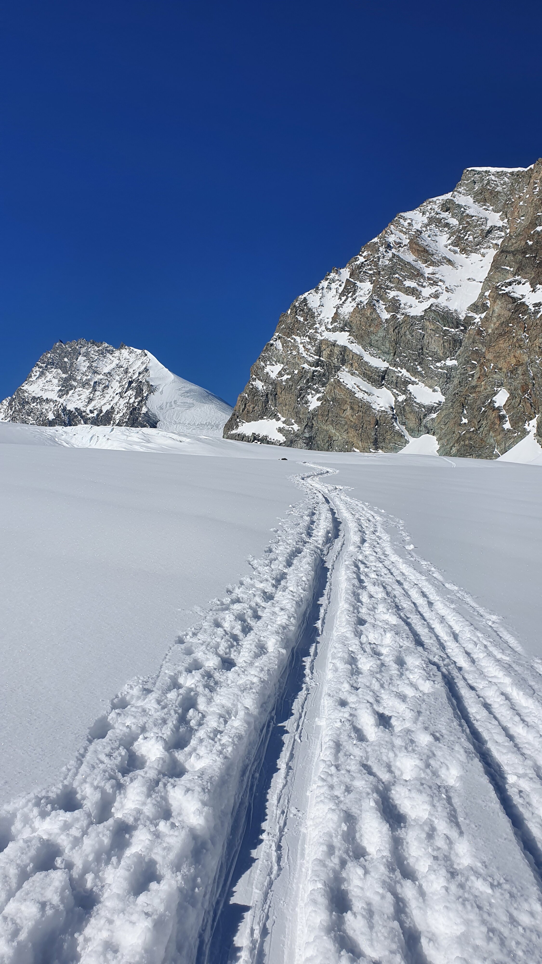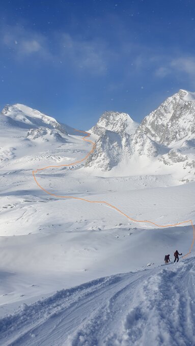 Once on the glacier, rope up and start the tour (we were 2 skiers and 1 splitboarder). Super sunny and not cold at all. The lower part of the glacier had some really nice and unexpected powder (10+cm snow on Saturday night). Follow the trail and slowly but steadily go higher. There were a couple of poles to signal the beginning of the trail.