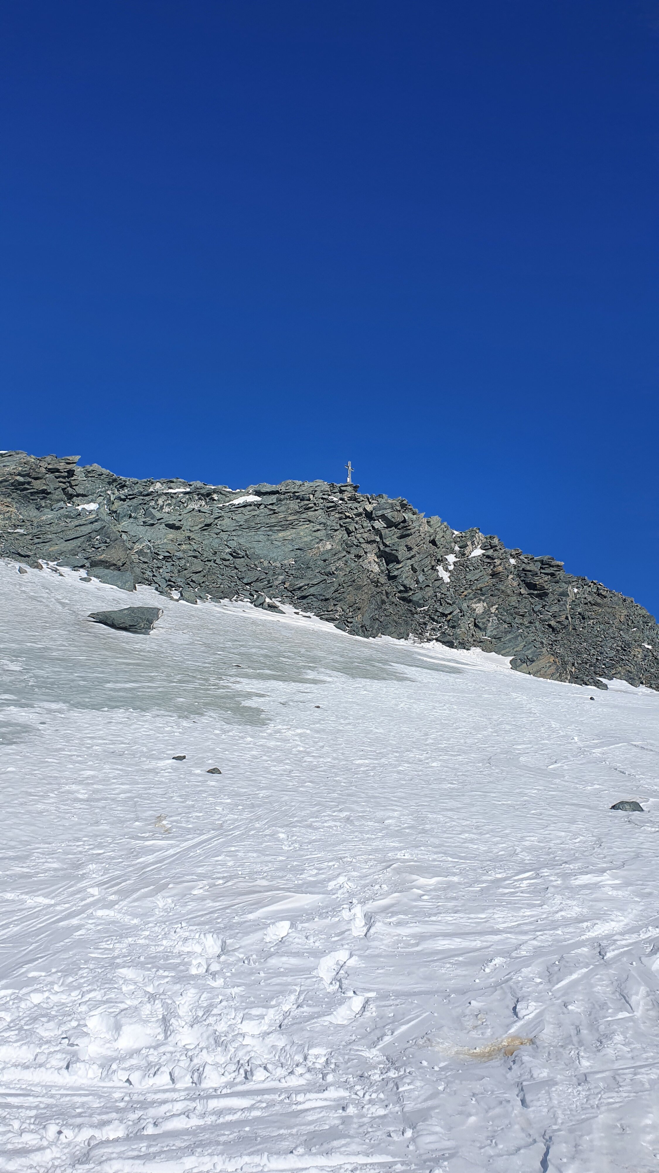 Then we went back down walking, to where we had left the skis/split. We descended still with boot crampons on (skiable if you are a good skier) and cross first the crevasse at the top of Adlerpass, then keep going down until we crossed the other crevasse at the bottom of Adlerpass.