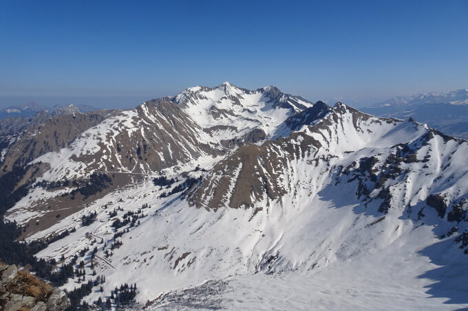 Einiges los auf dem Parkplatz Fildrich. Tourengänger gesehen am Landvogtehorn, Bodezhorn und natürlich auf der anderen Seite am Albristhorn. Wer den Winter satt hat: Die Chirgelischibeli lässt sich bereits schneefrei erwandern, auch an der Galmschibe dürfte es bald so weit sein.