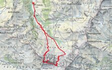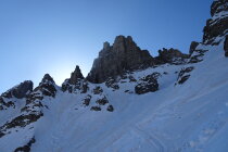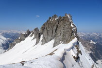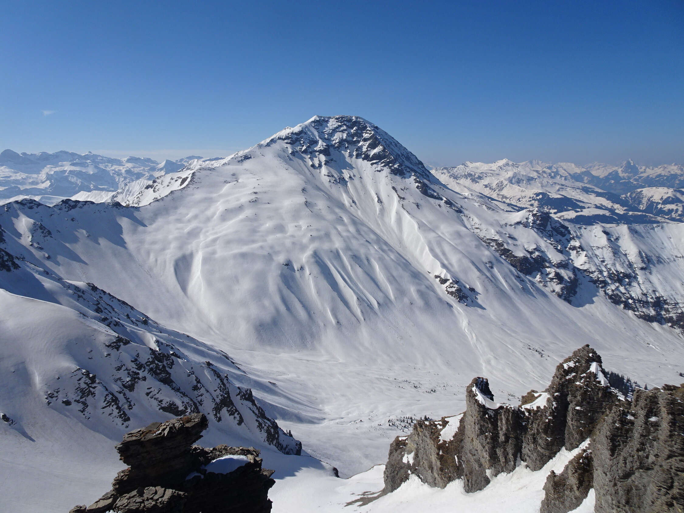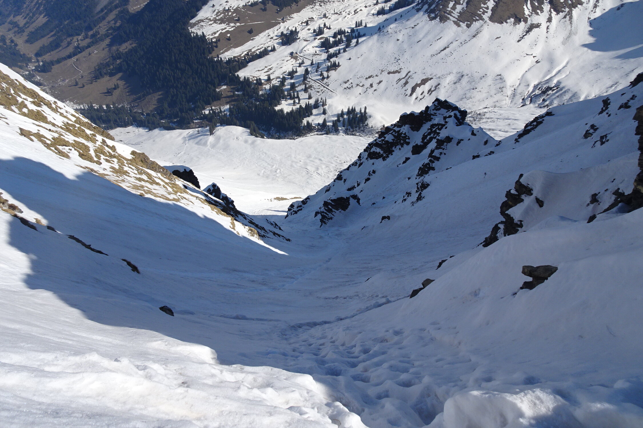 Ab Parkplatz Fildrich im Moment ca. 10 Minuten Portage. Vom Steinbode die immer steilere Nordflanke hoch. Unten schön griffig, die Lawinenkegel stören nicht gross. Im Nordcouloir selber sind die Verhältnisse hart und anstrengend, nur mit Harscheisen machbar. Mir wurde es schnell zu blöd und ich habe die Skier aufgebunden. Oben über den aperen Grat zum Skigipfel.