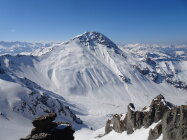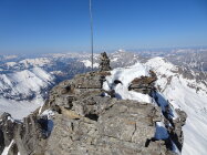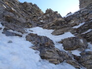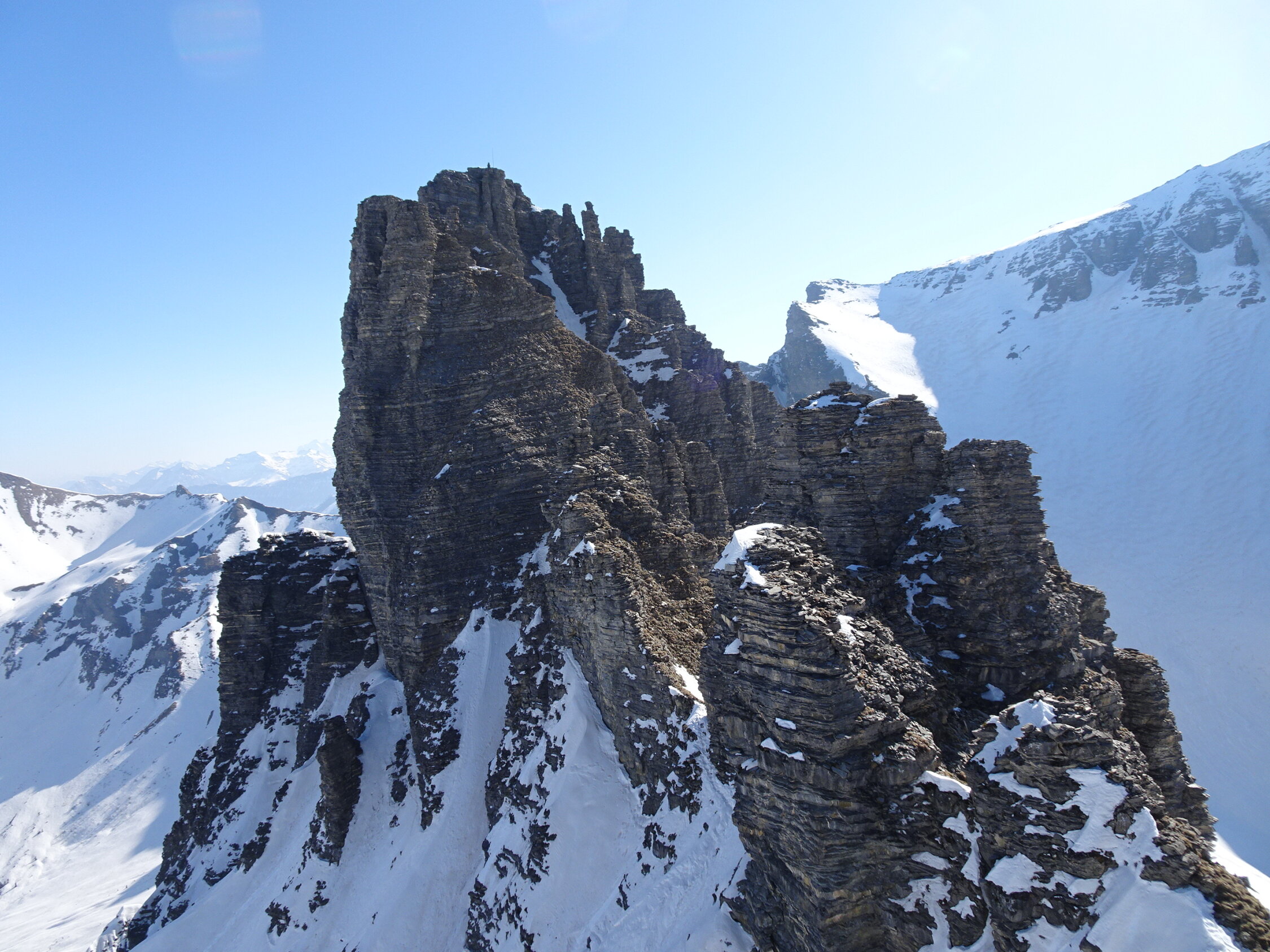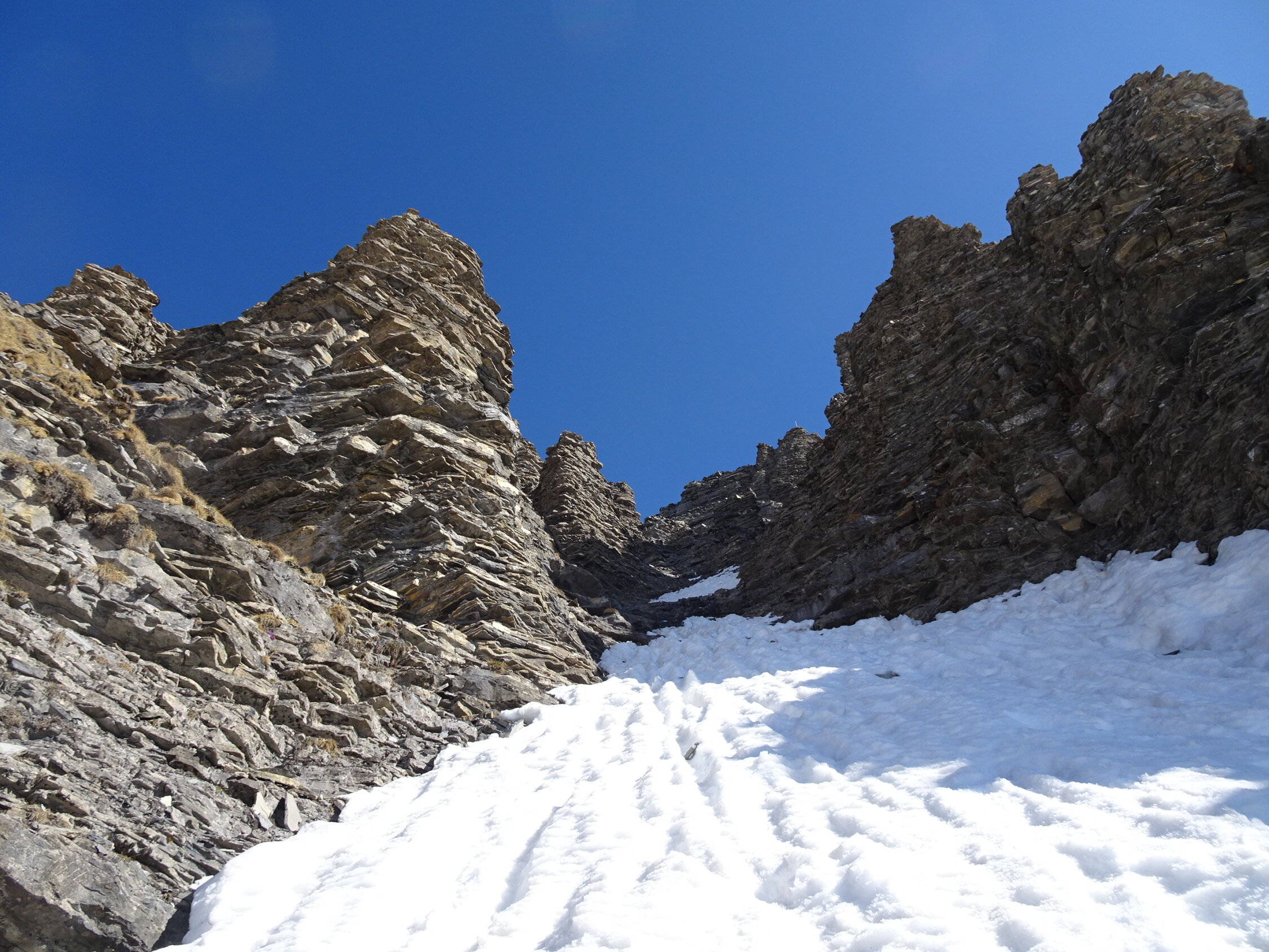 In der Sommerroute von Süden zum Hauptgipfel dann fast perfekte Bedingungen. Das Couloir sehr griffig, mit Pickel und Steigeisen (zwingend) äusserst effizient zu gehen. Trotzdem, die Steilheit macht diese Passage zu einer seriöseren Angelegenheit (v.a. im Abstieg), stürzen verboten. Etwas heikel war der Couloir-Ausstieg zum Steinmann. Anschliessend in leichter Kletterei (bis II) über trockenen, aber brüchigen Fels zum Gipfel.