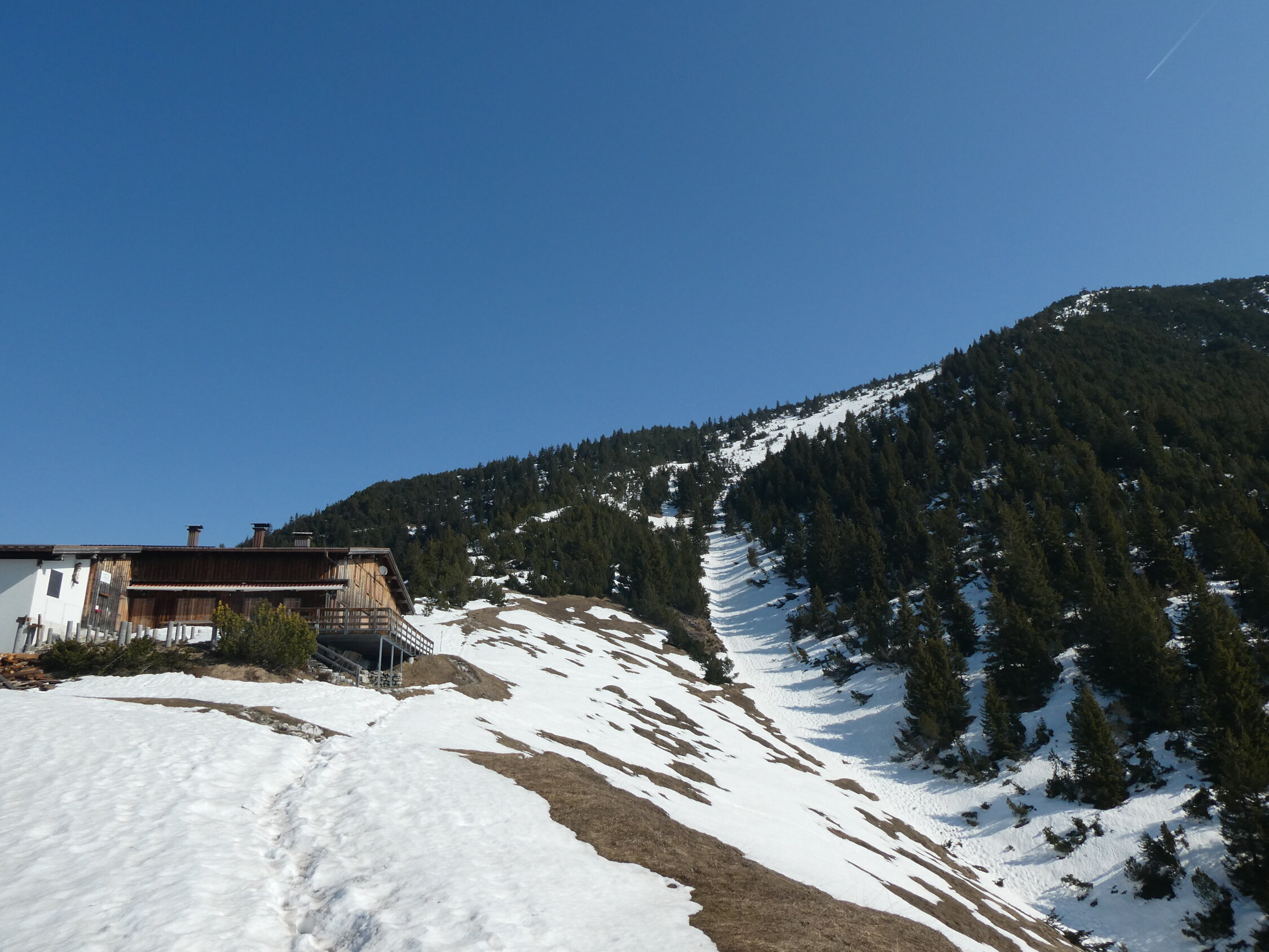 Oberhalb der Hütte fast durchgängig Schnee mit ordentlicher Spur.
