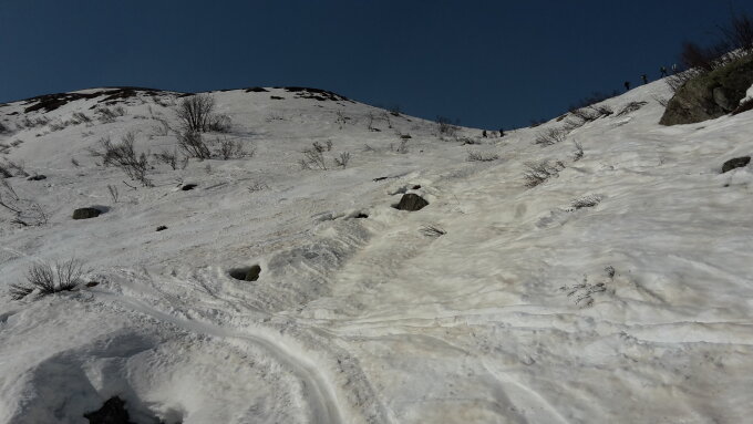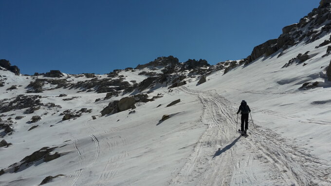 Aufstieg mit Abkürzung der Passstrasse durch die Staudenhänge, noch gut möglich. Gut griffige Spur. Bis Tätsch hauchdünne Eisplättchen auf sulziger Unterlage. Querung oberhalb Tätsch gut zu begehen. Nur zwei kurze apere Stellen. Aufstieg durch die grosse Rinne zur unteren Bielenlücke eher hart, ging jedoch recht gut ohne Harscheisen. Der Gipfelzustieg ab Skidepot ist schneefrei. Am Gipfel trotz eines leichten Lüftchens ganz angenehm zum Verweilen.
