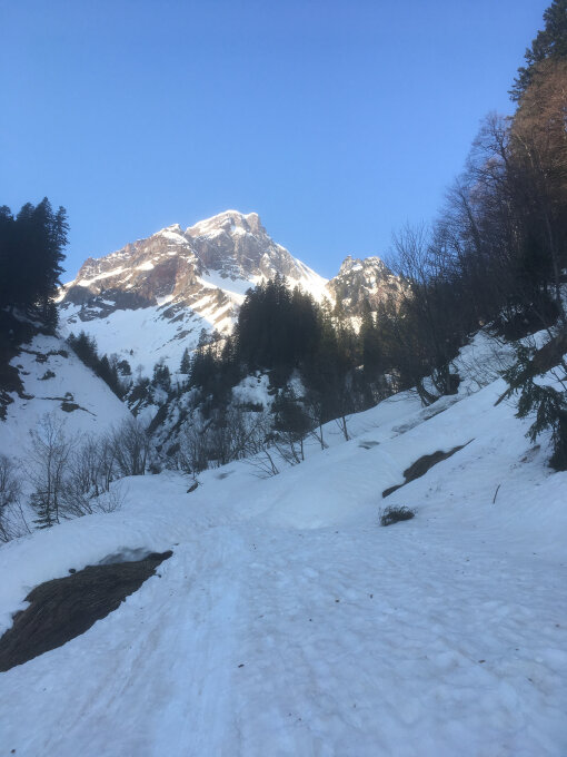 Bei frühem Aufbruch (vor 6.30 Uhr Winterzeit) kompakte Verhältnisse. Im Schandelstobel kleine Wegstrecken mit Tragen der Skier, ebenso bei Abfahrt (Steine).