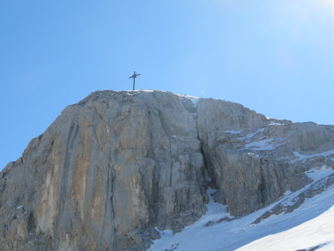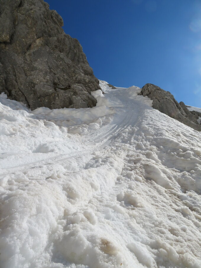 Sulzschnee. Das Felsband in guten Trittschnee mit oder ohne Steigeisen. Abfahrt, vorsichtig abrutschen.