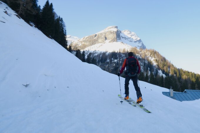 Bei den aktuell warmen Temperaturen könnte es beim Aufstieg auf dem Waldweg nach Windigstafel zu kurzen Tragepassagen kommen. Die Skilifte in Splügen hatten heute den letzten Saisontag, Skiliftunterstützung ist ab sofort keine Option mehr. Dafür können gegebenenfalls auch die Pisten für den Aufstieg genutzt werden.