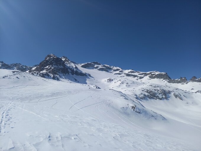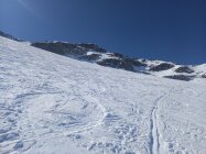 Aufstieg wie Abfahrt wenig Schnee. Steinkontakt möglich.