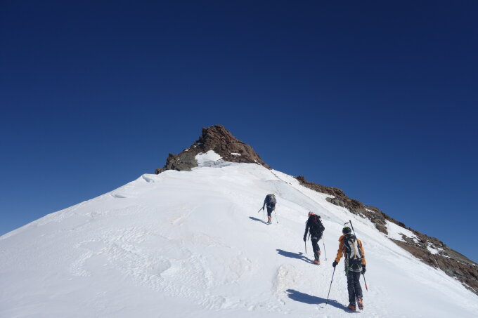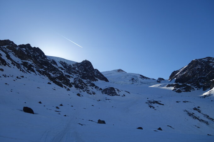 Brüche habe eine feste Schneedecke, keine Spaltenlöcher auf der Route gesichtet, aber es hat verhältnissmässig wenig Schnee dieses Jahr, angeseilt ist niemand gegangen. Ab Skidepot bis zum Sattel kann man nicht mehr mit Ski gehen, es hat je nach Route nur noch mehr eine dünne Schneeschicht auf Blankeis. Die meisten haben die Ski hoch und wieder runter getragen. Auch kam es zu einen Abrutschunfall 50 hm am Blankeis. Am Grat hat es direkt nach dem Ausstieg aus der Flanke eine Spalte.