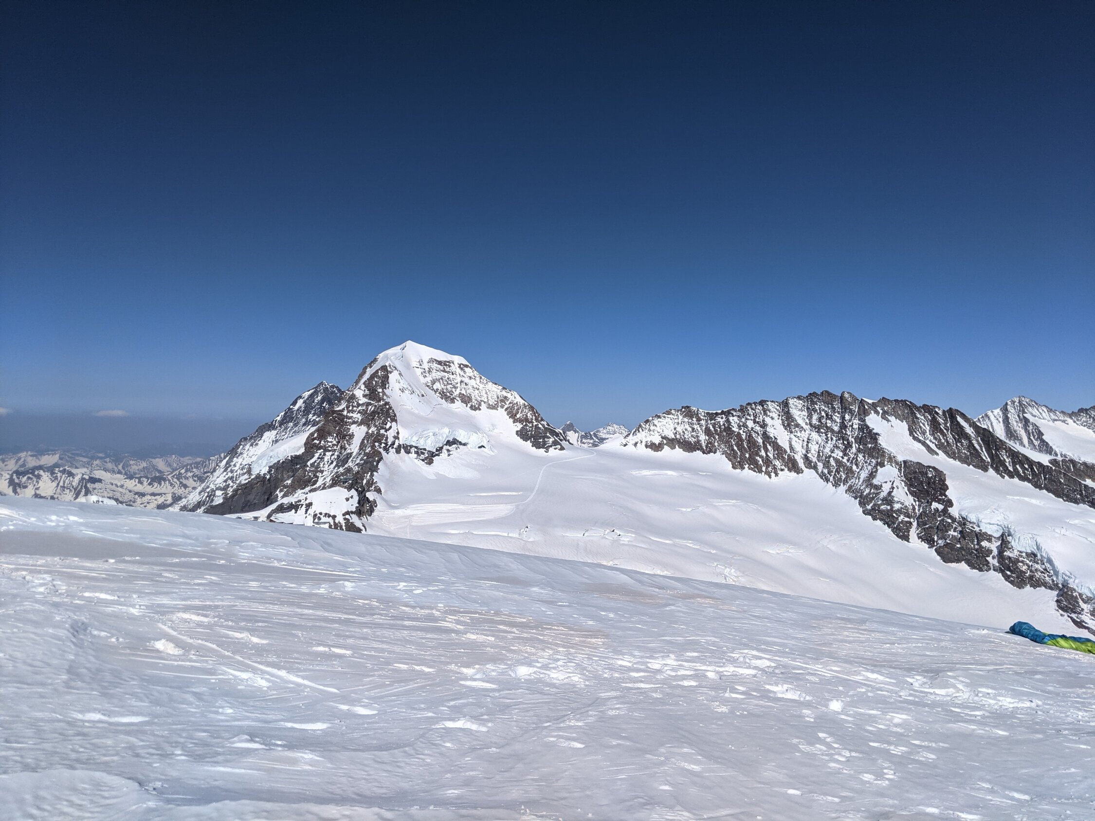 Im Aufstieg vom Jungfraufirn guter Schnee und Spur.