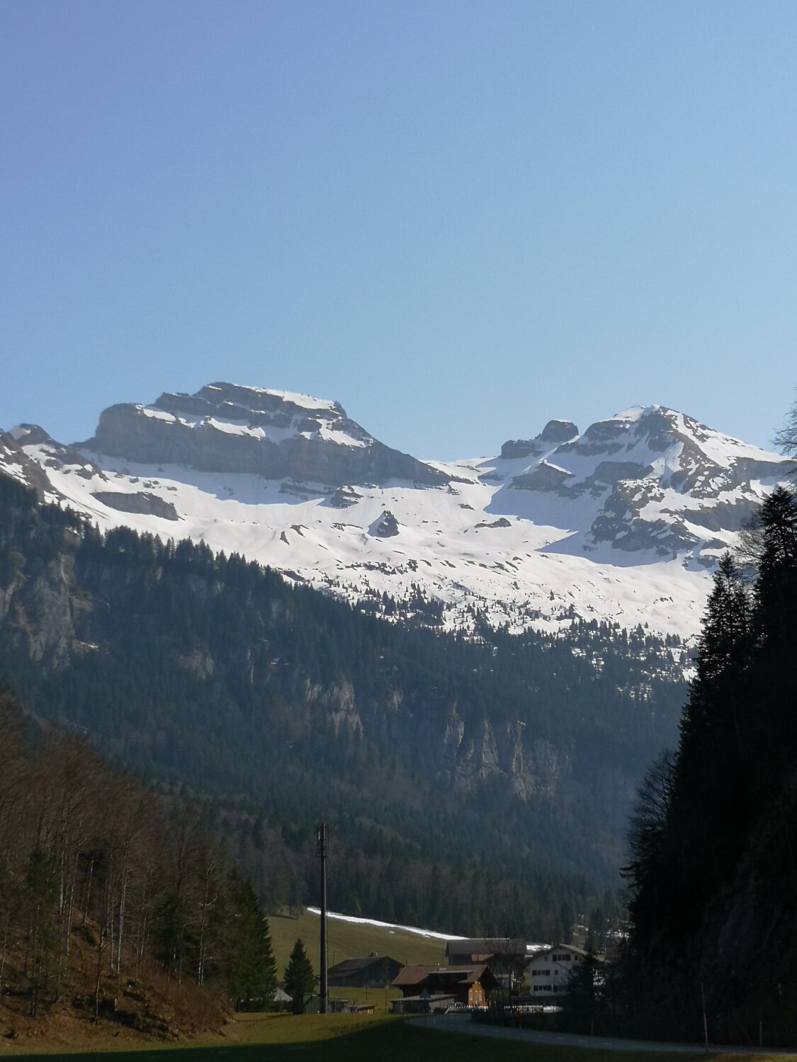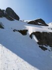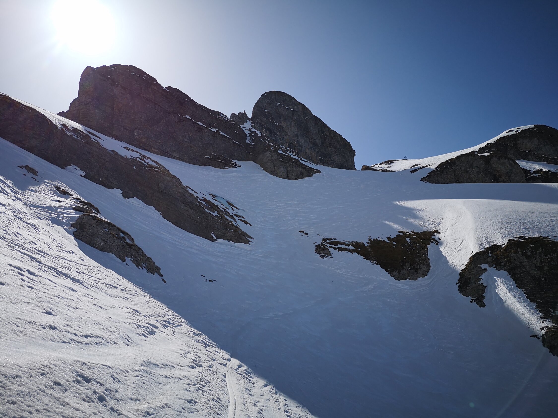 Via Steinhüttli unter den auch um 13 Uhr noch harten Forstberghang. Ich benutzte meine Steigeisen (da Splitboarder mit Softboots), was kein Luxus war...