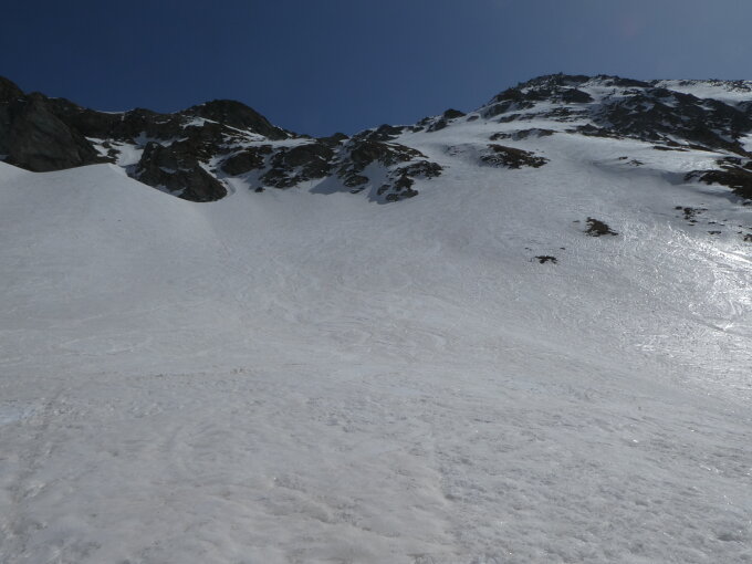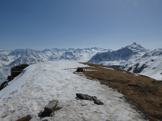 Genügend Schnee bis ca. 20 Höhenmeter unter Gipfel, dort Skidepot. Gratübergang bei ca. 2520m sehr gut gespurt. Harscheisen waren nicht notwendig.