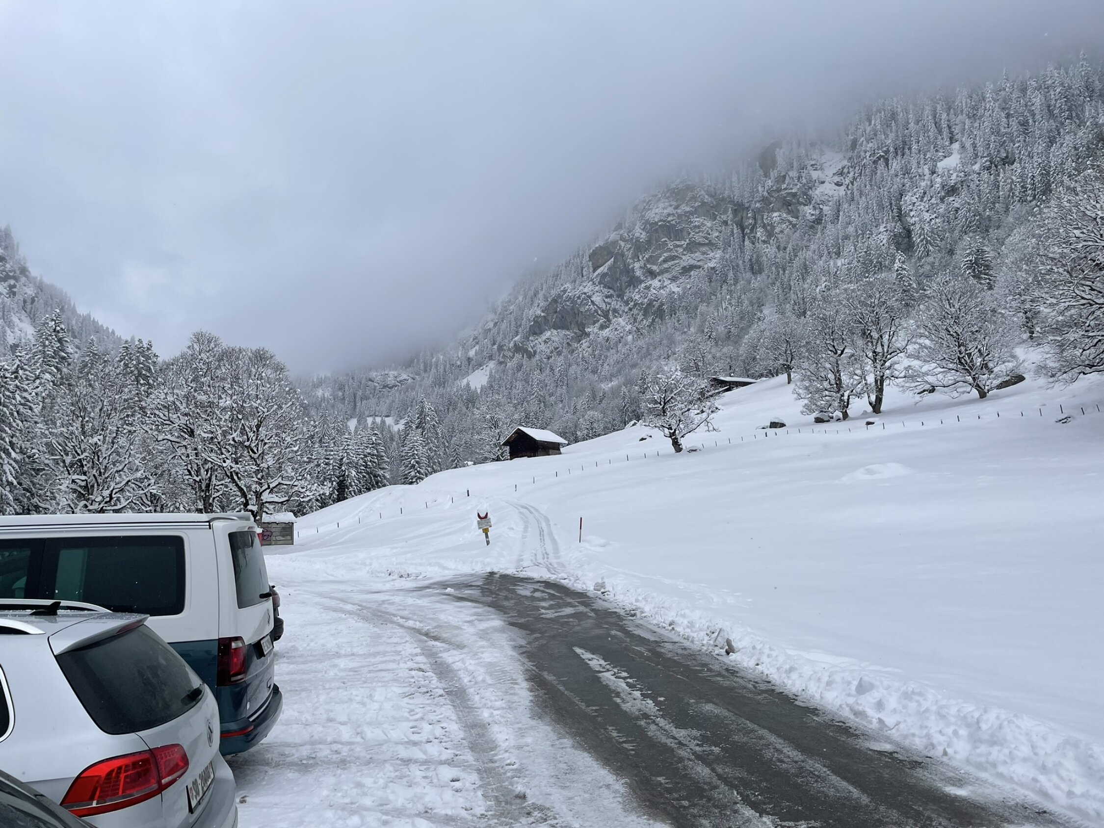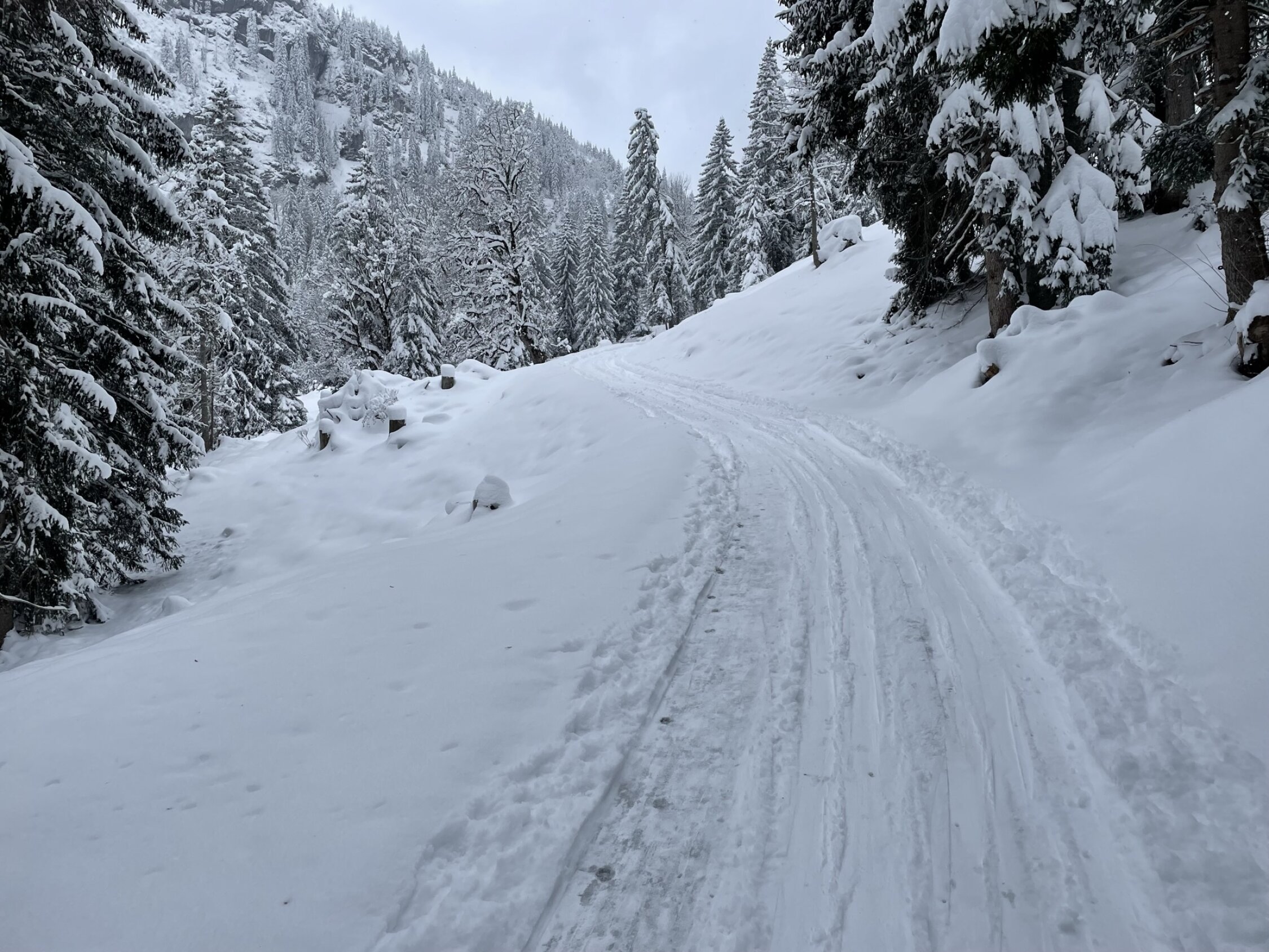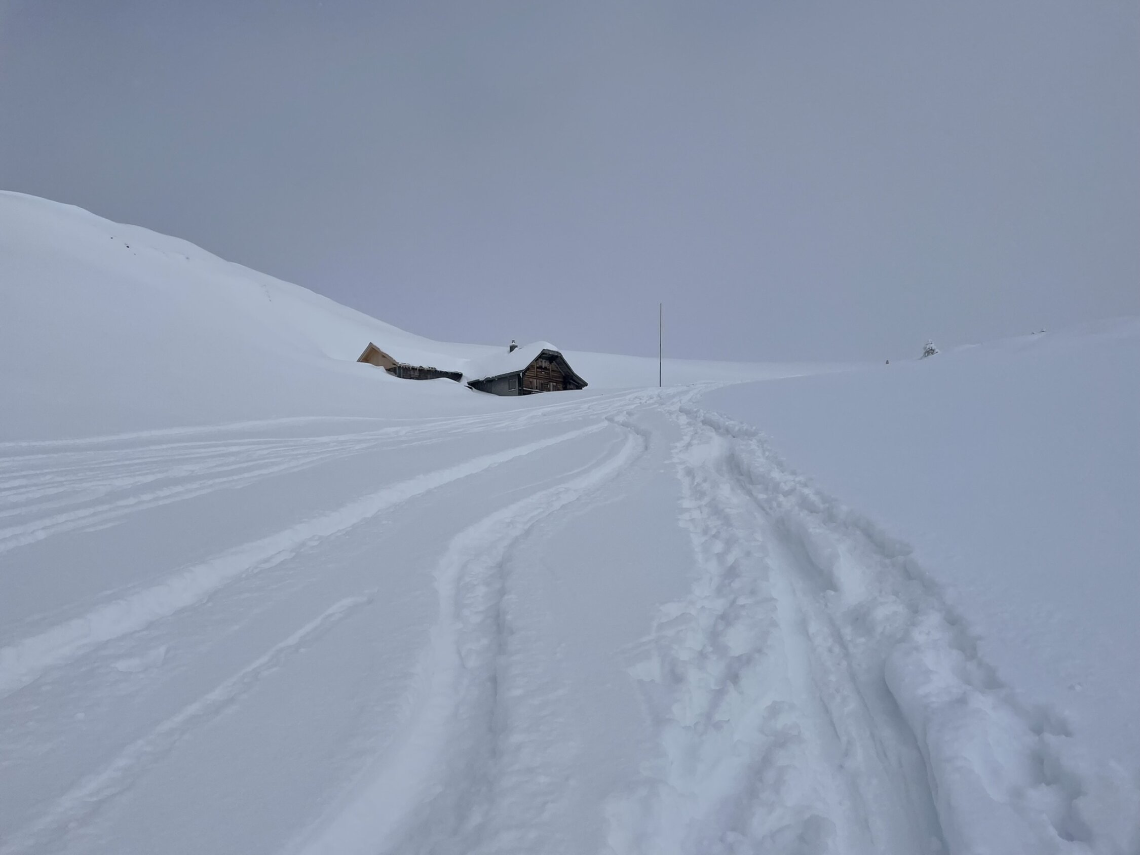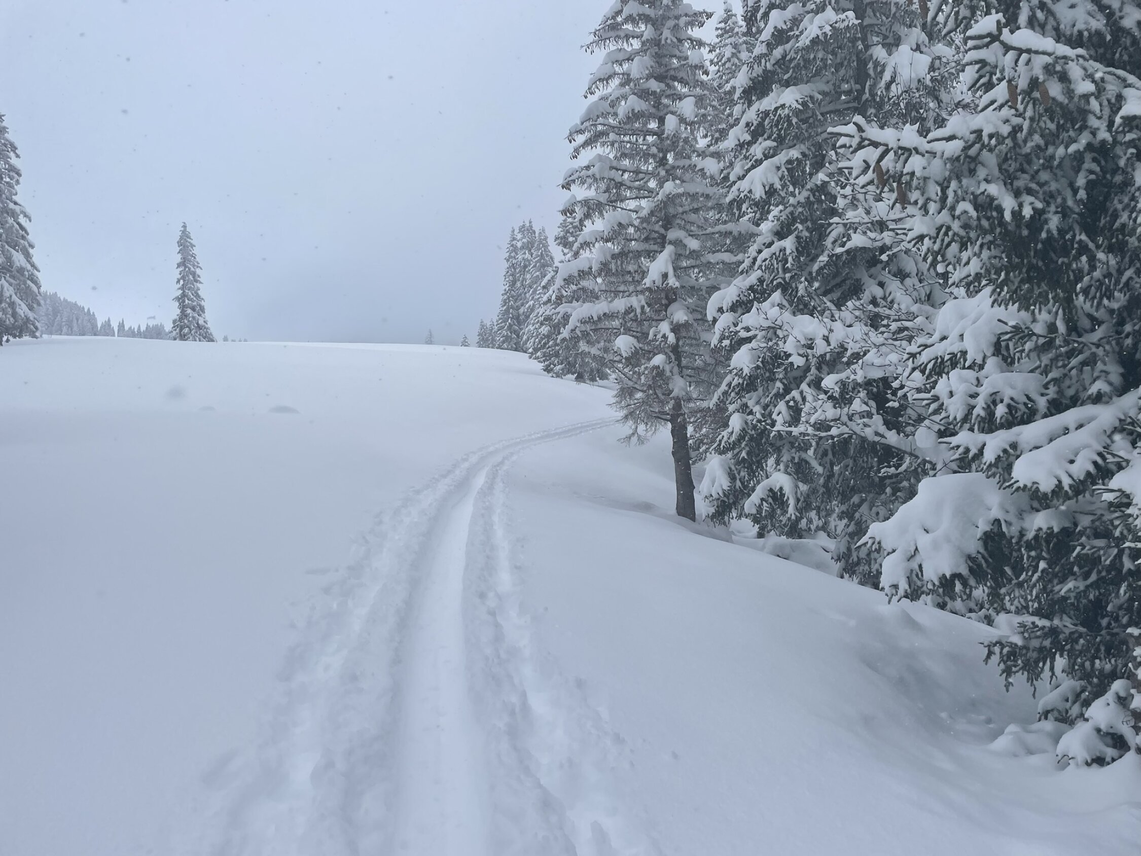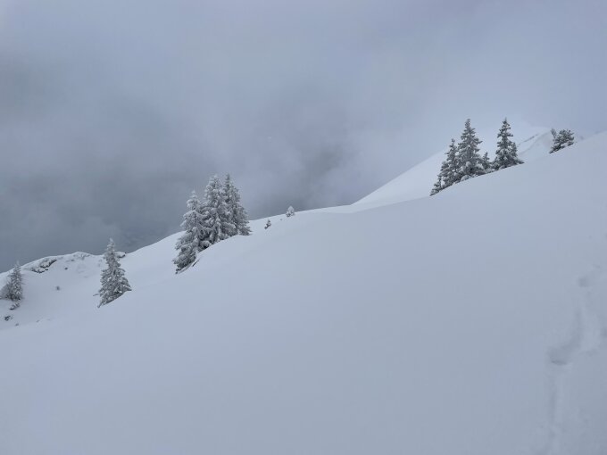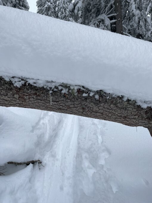 ca. 30-40 cm Neuschnee. Feinster Pulver allerdings mit Vorsicht zu geniessen da an einigen Stellen ohne Unterlage. Da flache Tour in der Abfahrt fast immer auf der Aufstiegsspur. Tour wie im Frühwinter.