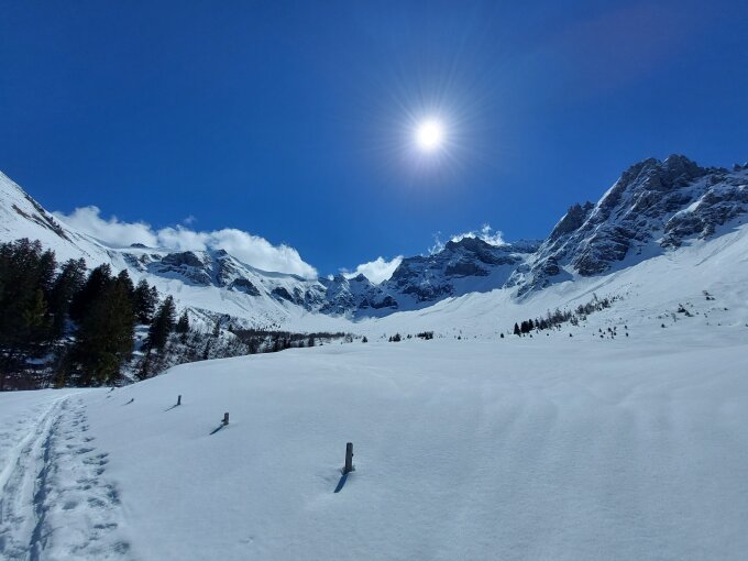 Aufstieg: Bis zur Brücke ist der Weg schneefrei. Der Aufstieg von der Brücke bis zum Gipfel kann ohne Harscheisen problemlos begangen werden. Im Gipfelhang hatte es eine Spur, die sehr hilfreich war.