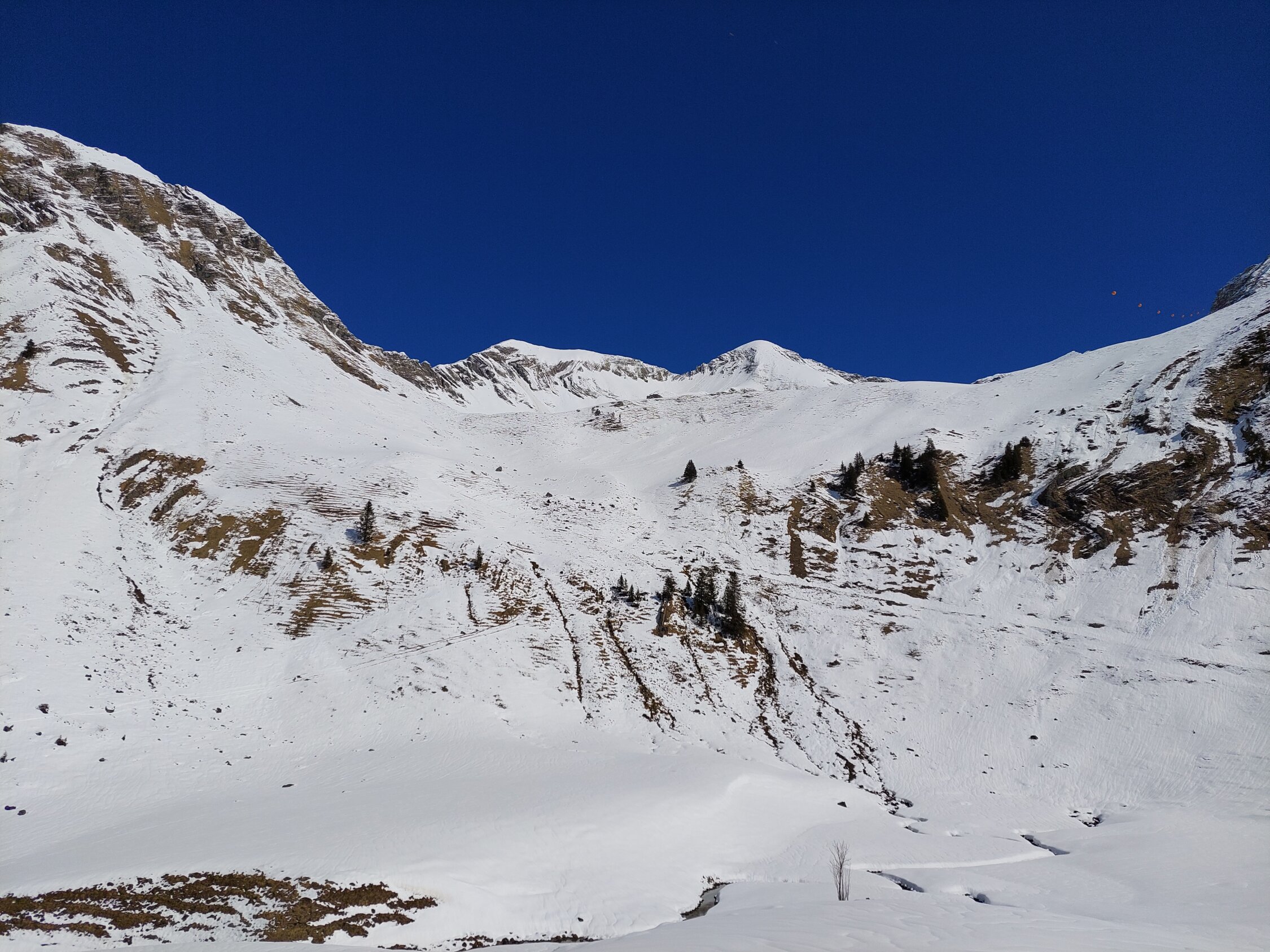 Abfahrt: Vom Gipfel bis zurück ins Tal hatte es Hartschnee, Nassschnee und Sulz mit kurzen Stellen Bruchharsch. Ich bin in den West- und Nordhängen Richtung Erbithore und dann hinunter Richtung Oberberg abgefahren.