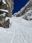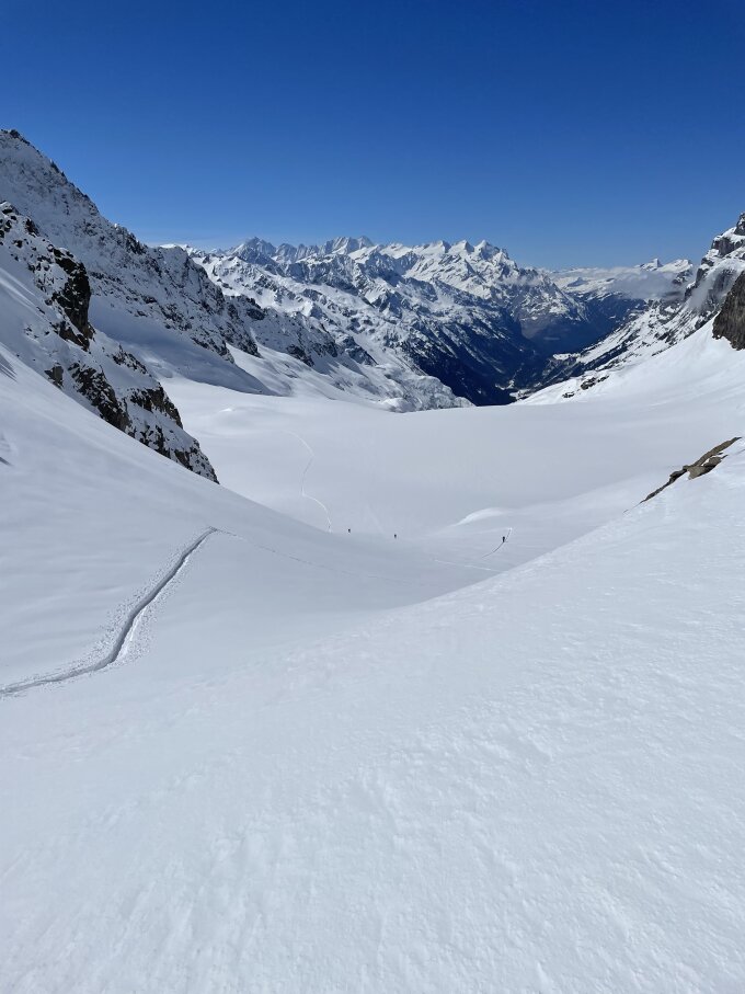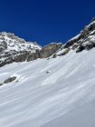 Gut gesetzter Schnee, Südseite jedoch schon sehr schwer am Morgen. Abseilstellen problemlos, obere wäre problemlos fahrbar gewesen. Viel Spur Arbeit. Am Grassen toller Pulver bis etwa 2400m, danach anstrengender schwerer pulver. Die letzten 200 hm teils zu Fuß, teils gestöckel.