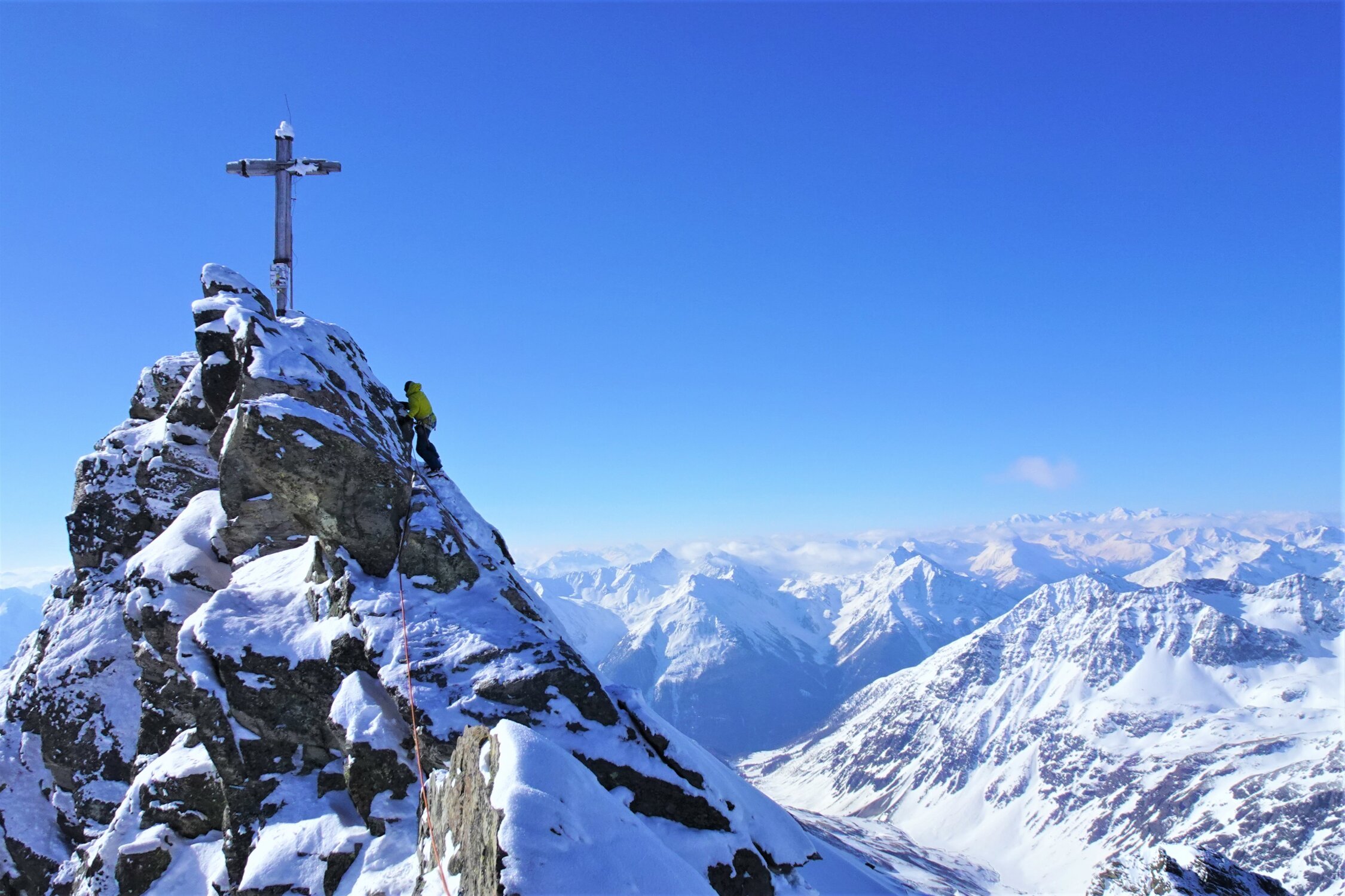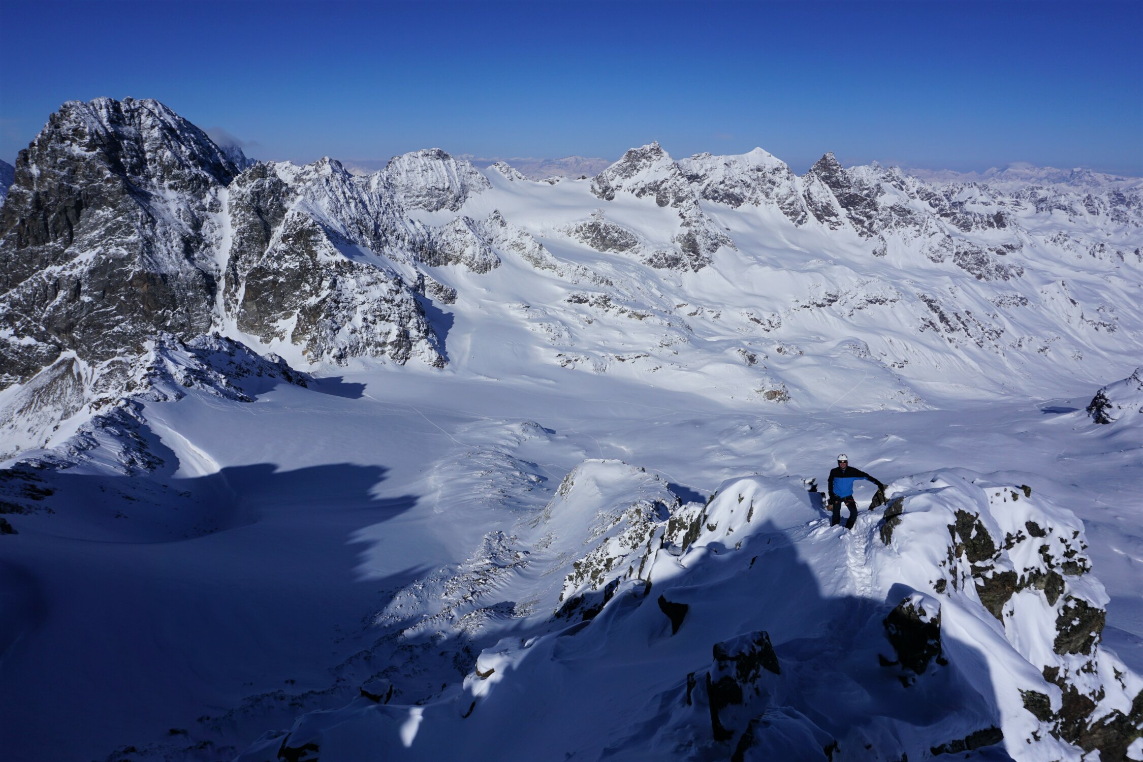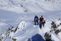 Der Gipfel ist derzeit nur direkt über den Grat erreichbar. Die Variante mit dem kurzen Abstieg von der letzten Scharte ist derzeit nicht möglich, da man auf Grund des Schneemangels eine glatte Platte traversieren müsste. Die ersten Hm unterhalb des Skidepots sind mit Vorsicht zu genießen, da es jede Menge versteckter Steine gibt.