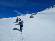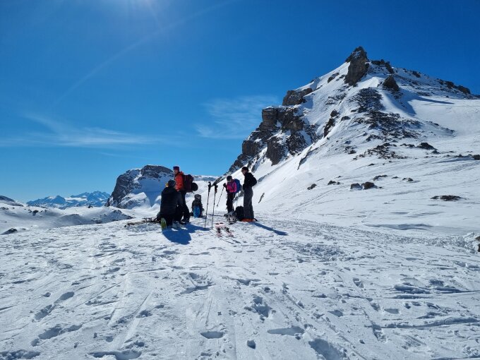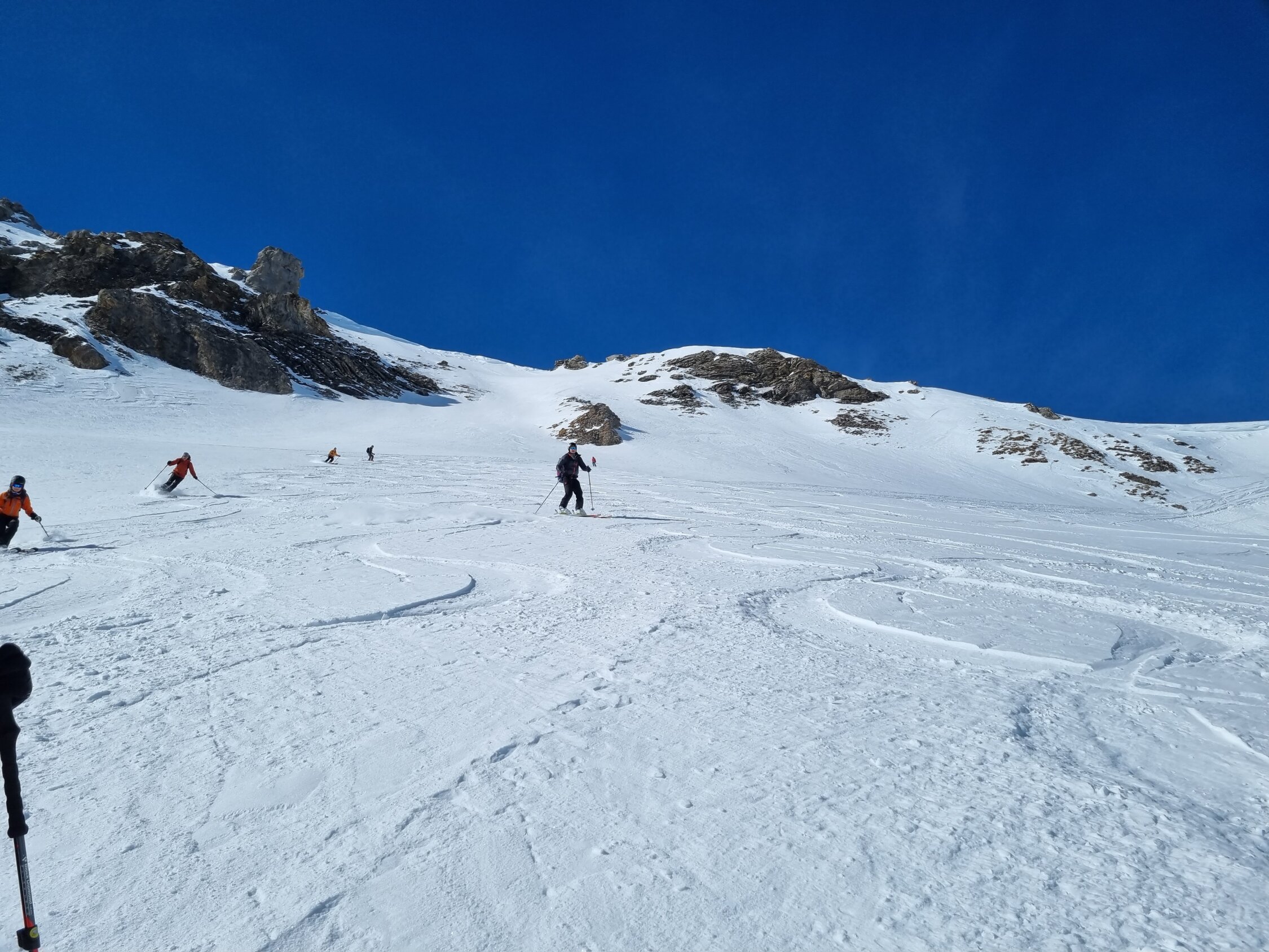 Im allgemeinen Hartschnee. Bei der Abfahrt vom Chindbetti-Pass gab es feinsten Pulverschnee. Die Abfahrt nach Kandersteg war ohne Steinkontakt gut machbar.