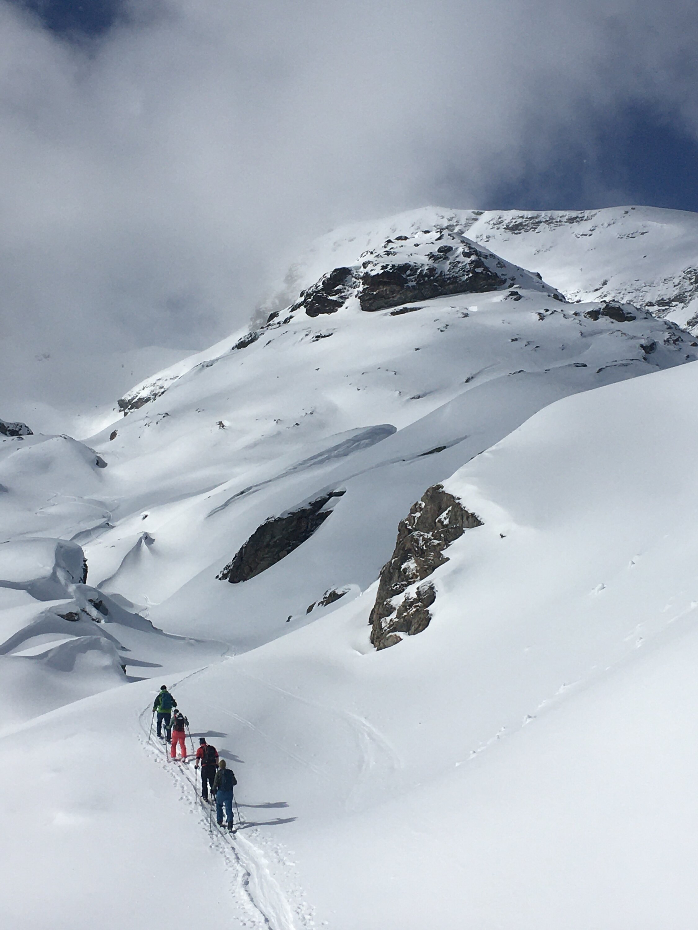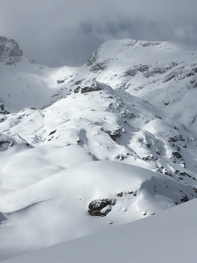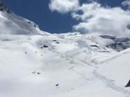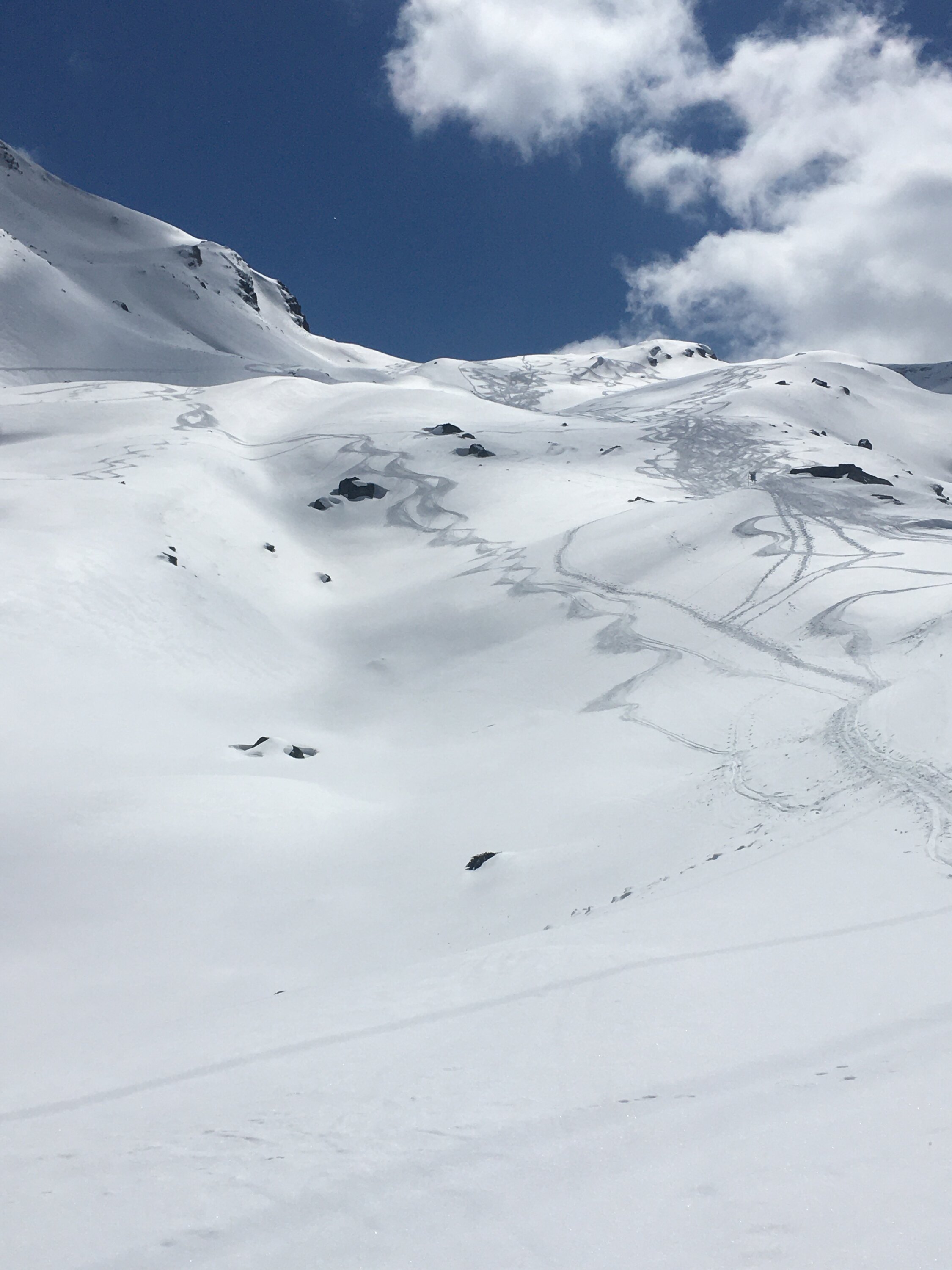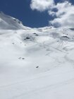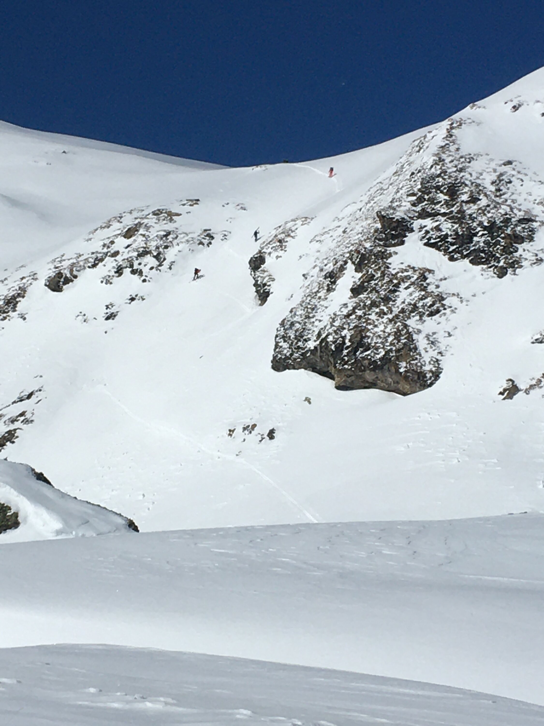 Perfekte Verhältnisse, bin froh, dass ich die Aufstiegsroute abgefahren bin, hatte in dieser Route noch nie so tolle Verhältnisse. Im grossen Nordosthang war eine Gruppe italienischer Tourengänger hoch bis zur Felswand Piz d´Emmat Dadaint in der Flanke Fuorcla d´Emmat, im Aufstieg auf der linken Seite, sehr steil und bis 14 Uhr um Schatten. Zwei nachfolgende Tourengänger haben etwa Auf Höhe 2600 m umgekehrt, Wumgeräusche und instabile Schneedecke. War unverantwortlich von der italienischen Gruppe diese Spur zu ziehen, viel sicherer wäre der Aufstieg auf der rechten Seite wo schon früh die Sonne den Schnee bearbeitet. Glück gehabt, es ist nichts passiert!