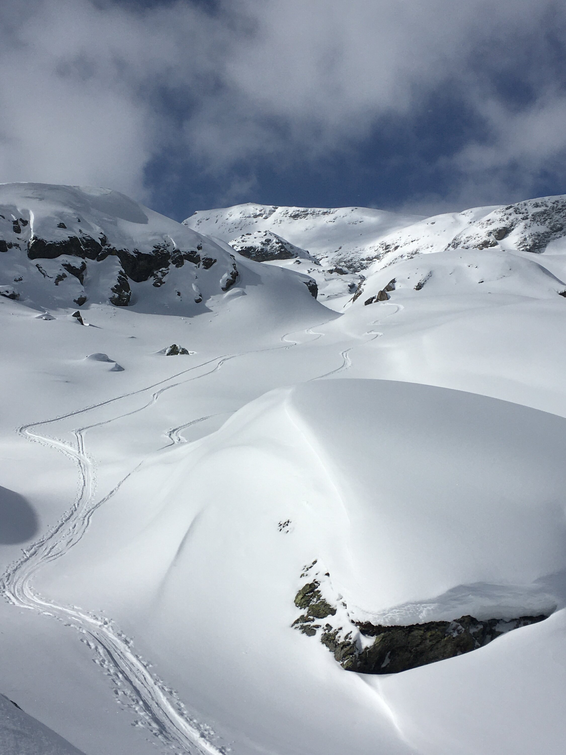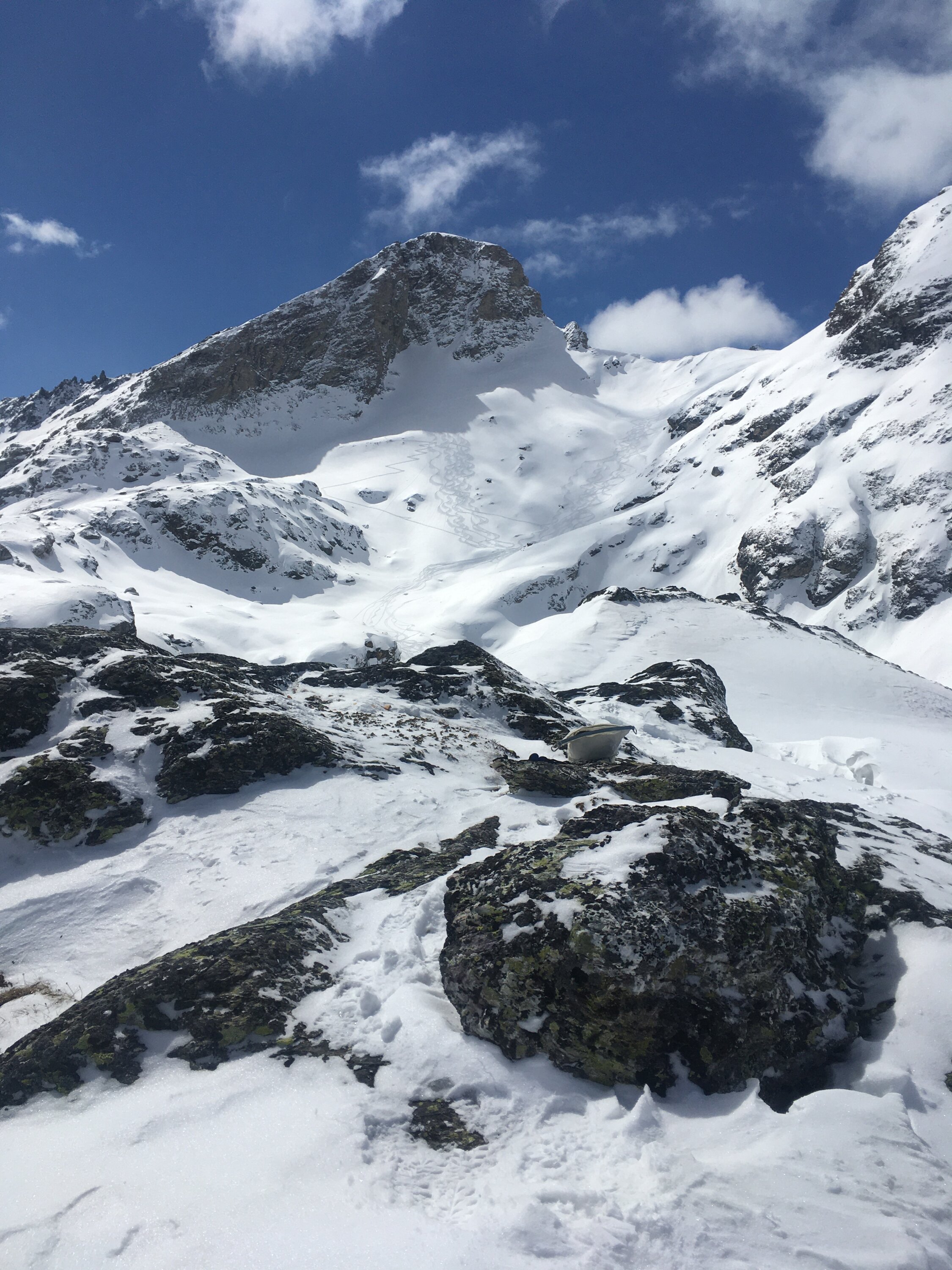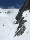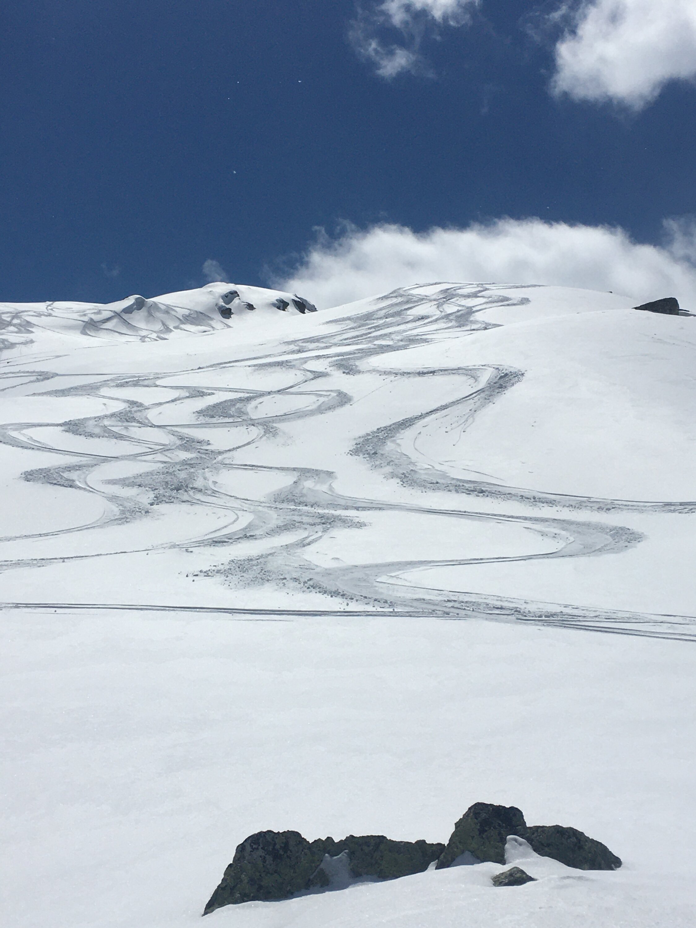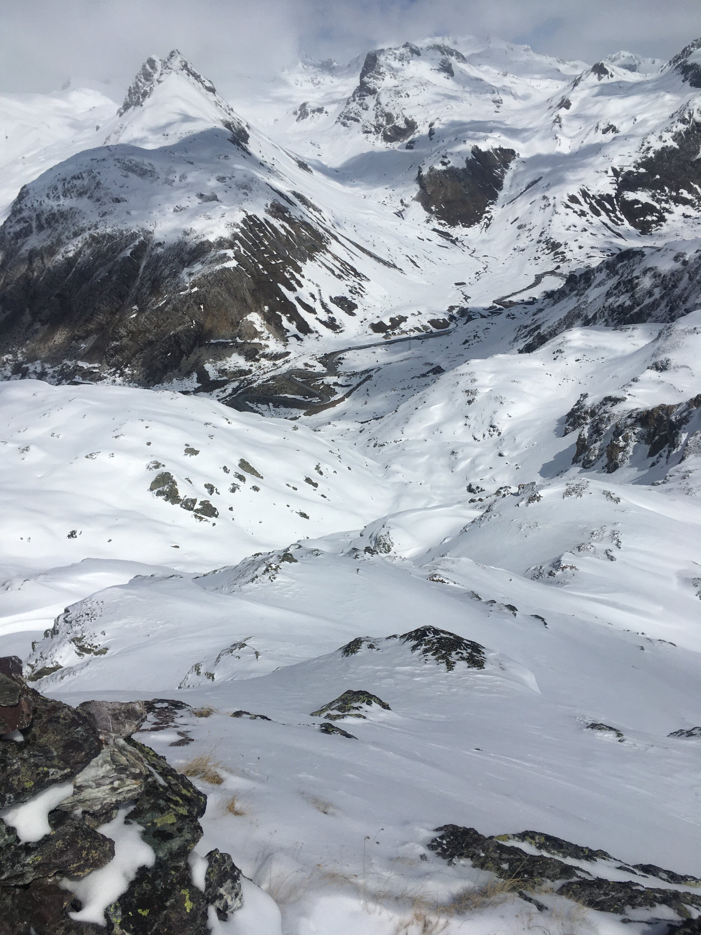 Perfekte Verhältnisse, bin froh, dass ich die Aufstiegsroute abgefahren bin, hatte in dieser Route noch nie so tolle Verhältnisse. Im grossen Nordosthang war eine Gruppe italienischer Tourengänger hoch bis zur Felswand Piz d´Emmat Dadaint in der Flanke Fuorcla d´Emmat, im Aufstieg auf der linken Seite, sehr steil und bis 14 Uhr um Schatten. Zwei nachfolgende Tourengänger haben etwa Auf Höhe 2600 m umgekehrt, Wumgeräusche und instabile Schneedecke. War unverantwortlich von der italienischen Gruppe diese Spur zu ziehen, viel sicherer wäre der Aufstieg auf der rechten Seite wo schon früh die Sonne den Schnee bearbeitet. Glück gehabt, es ist nichts passiert!
