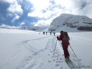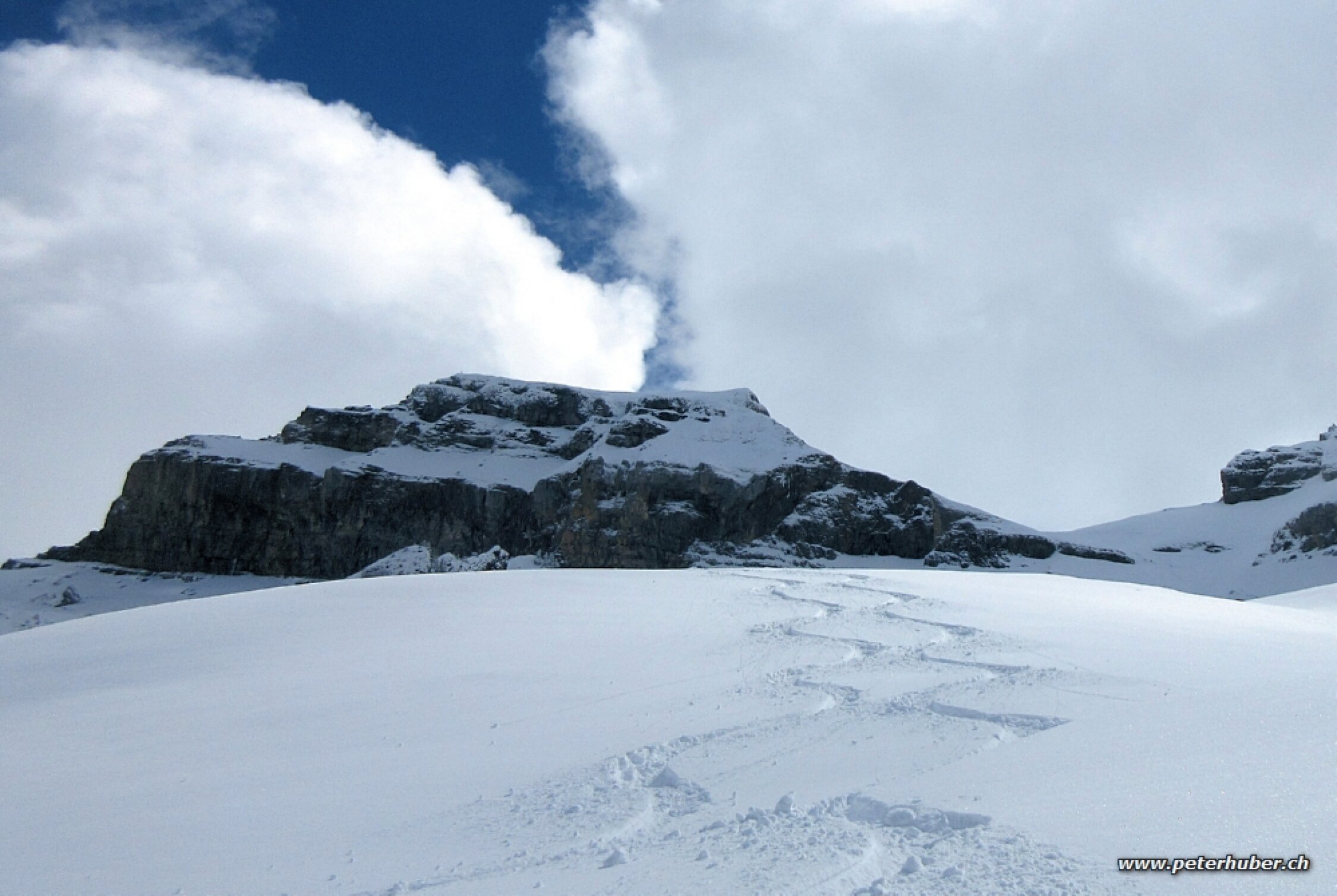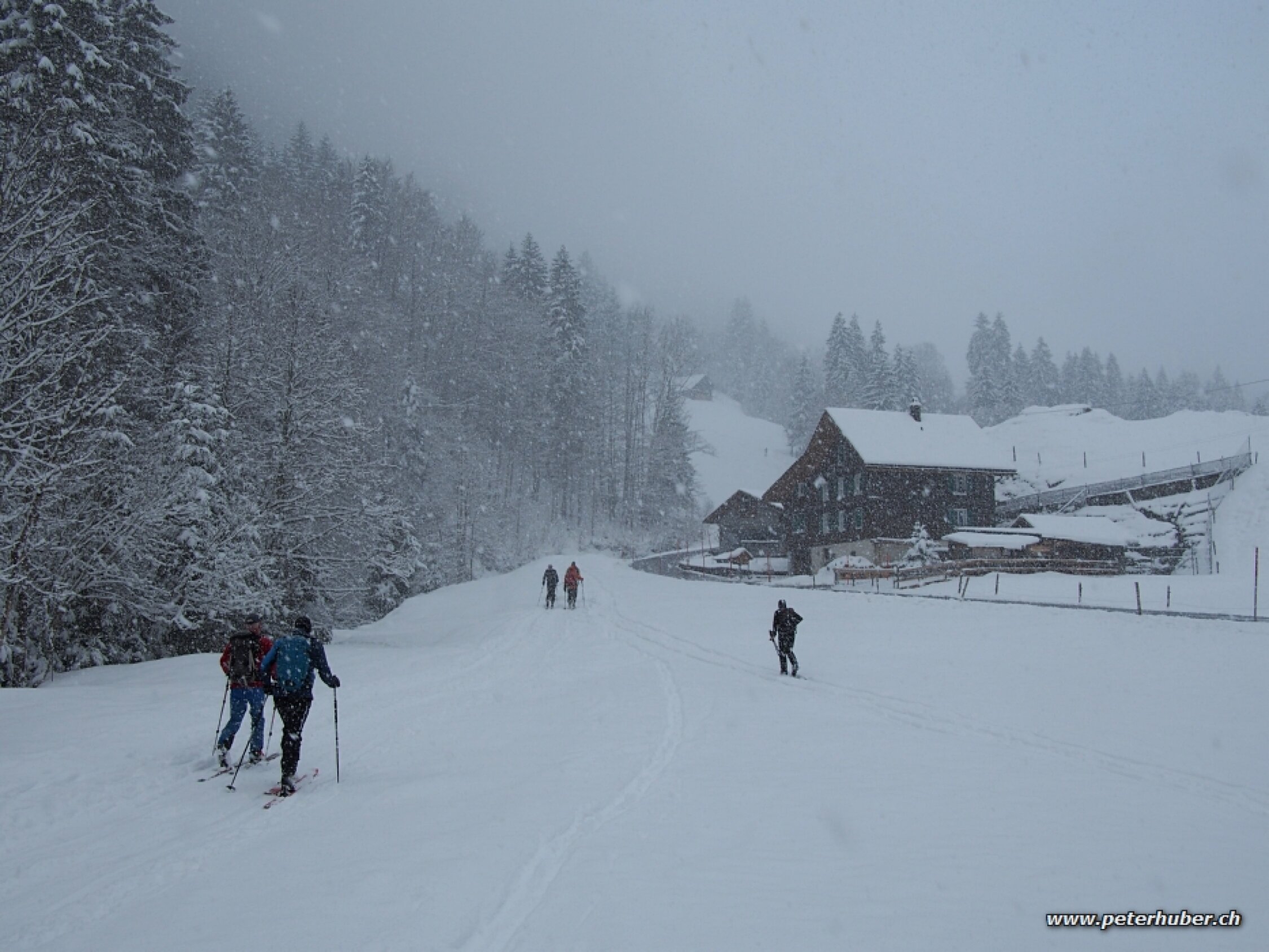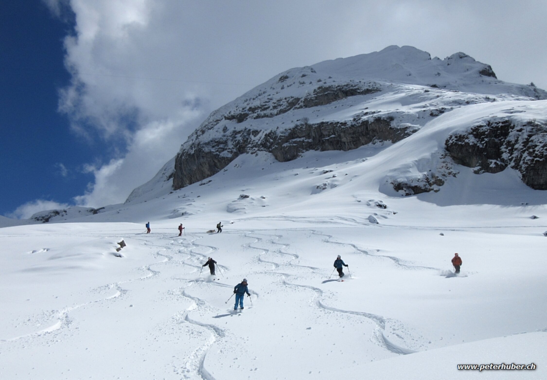 Abfahrt: Schöner Pulverschnee. Gelegentlich spürt man den Untergrund. Dann von der Chöplishütte nochmals aufgestiegen bis neben das Chalberstöckli. Nochmals schöner Pulver, gegen den Wald hin langsam fecht. Abfahrt bis zum Parkplatz problemlos möglich.