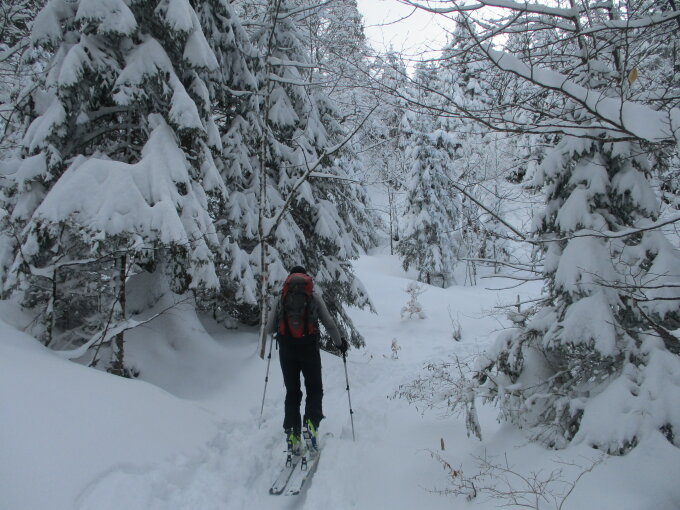 Mit der Sonne kam die Wärme, und mit der Wärme wurde der schöne Pulver rasch schwer. Im Abstieg knietief bis auf den Grund eingesunken und oft die Felsen unter den Schneeschuhen gespürt. Insofern war mir nicht ganz wohl, denn meiner Vermutung nach bestand heute sehr wohl die Gefahr, mit den Schneeschuhen in eine Kalkspalte des schneebedeckten Karrenfeldes einzubrechen. Dort, wo der Schnee bereits schwer geworden war, war´s im Abstieg mühsam. Ähnliche Verhältnisse galten heute auch für meinen Tourenpartner Vladi auf Skiern, wobei mit diesen ein Kalklpaltensturz eher nicht zu erwarten war, dafür aber häufig Grundkontakt.