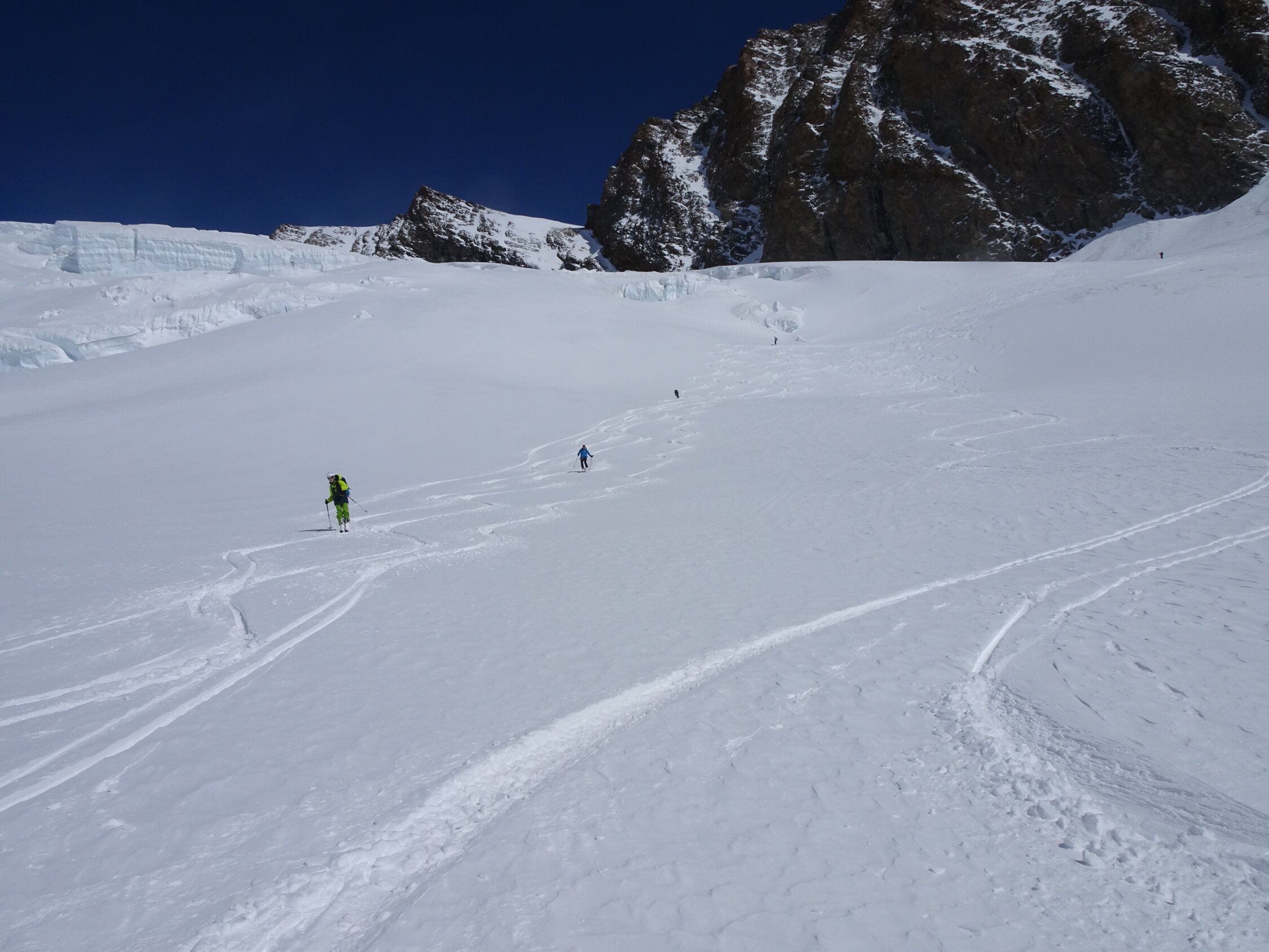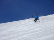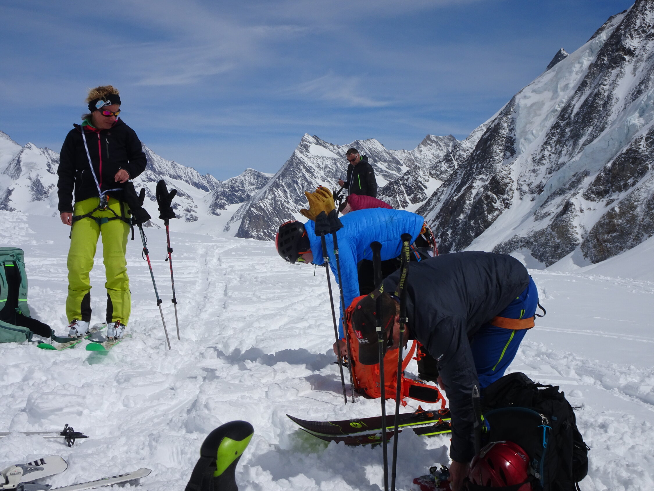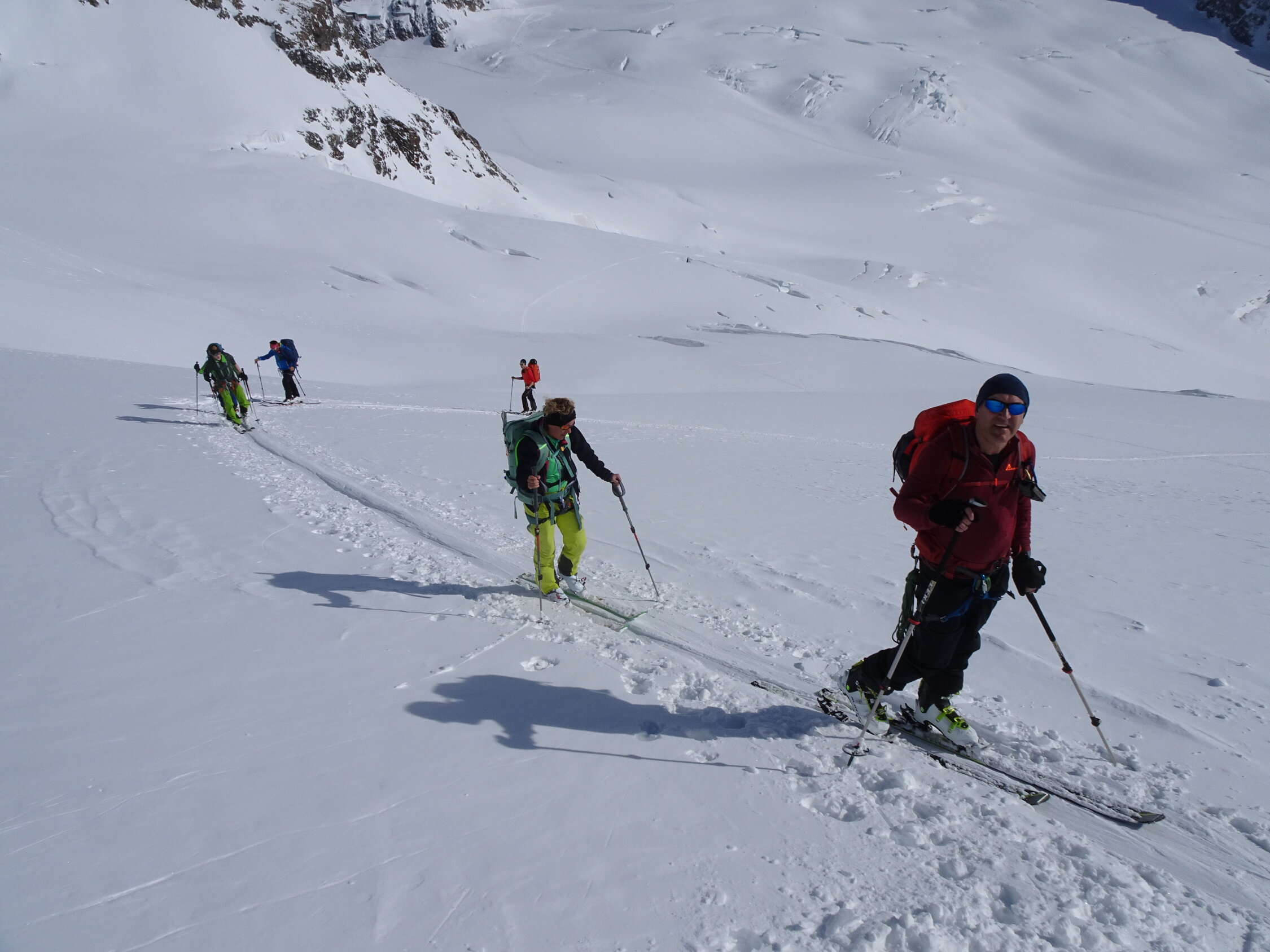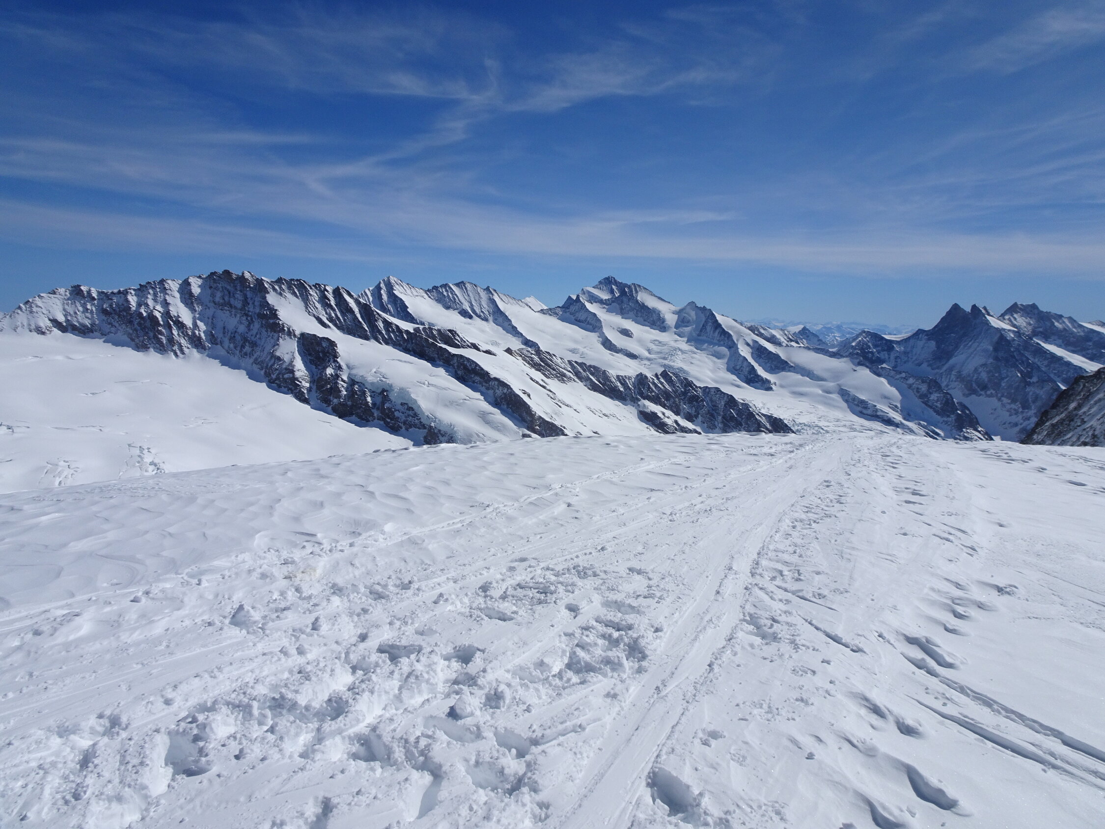 Schnee: ab Jungfraujoch bis zum ersten anfellen Pulver top, Abfahrt über den Kranzbergfirn ebenfalls Pulver aber bereits etwas schwerer, ab Lötschenlücke schwerer Pulver mit abnehmender Höhe dann sogar Sulz(wen wunderts bei diesen warmen Temperaturen), im Aufstieg jeweils sehr gute Spur, Abfahrt noch bis Blatten möglich(sehr nasser Schnee) aber nicht mehr lange ohne die ersten Tragestrecken