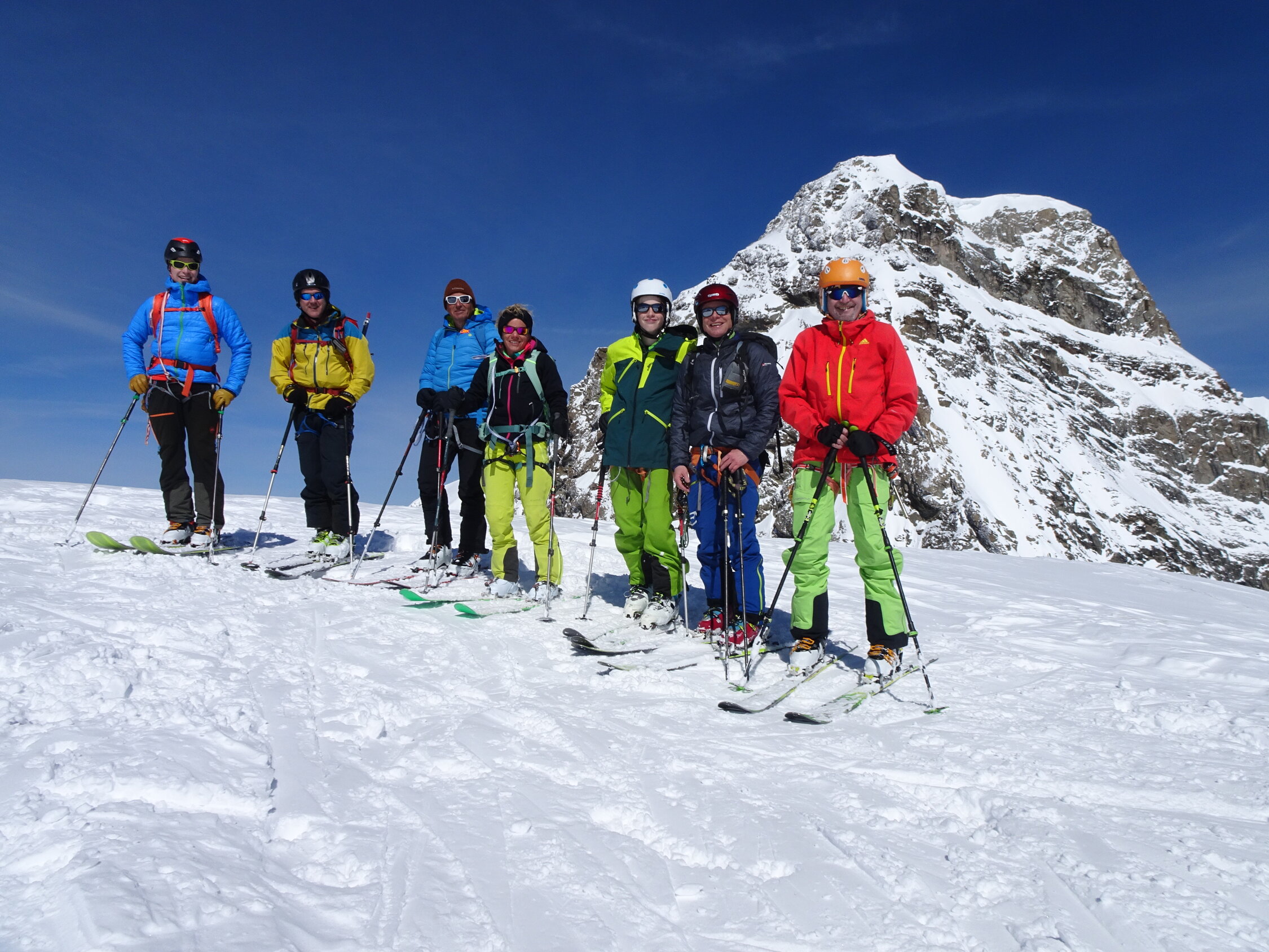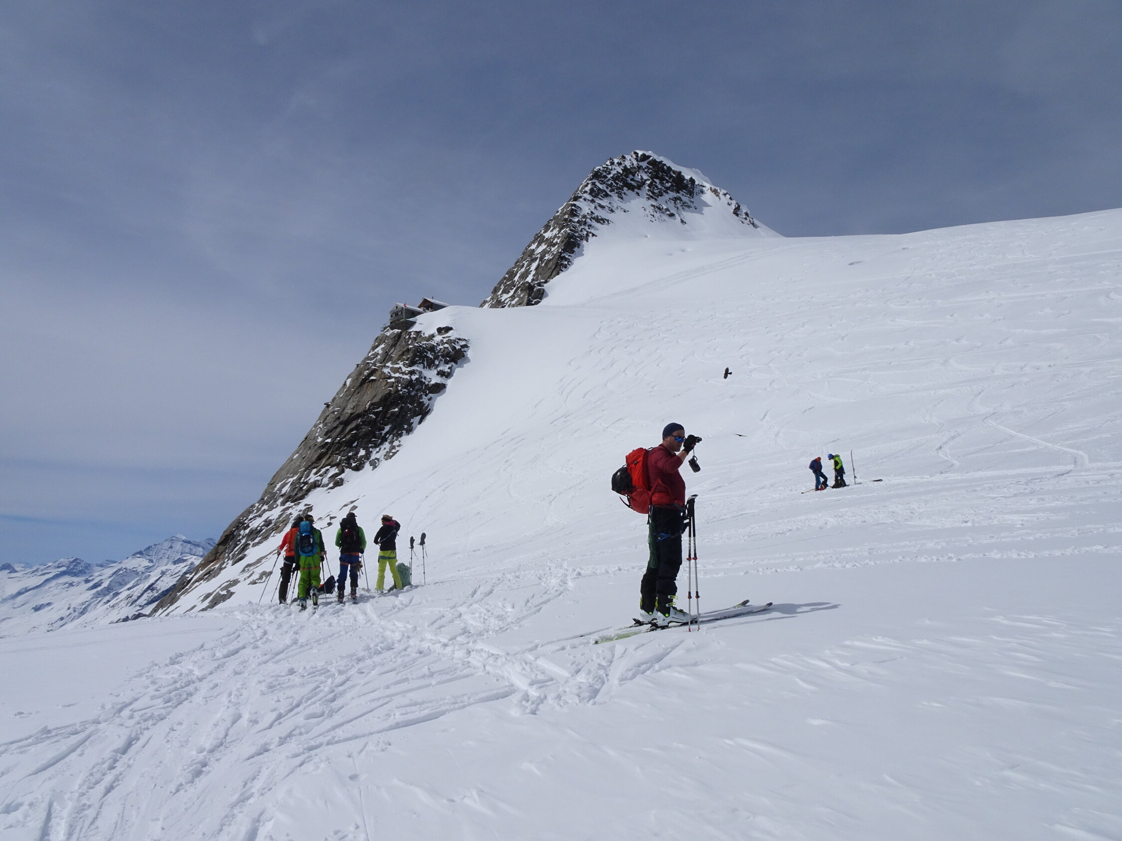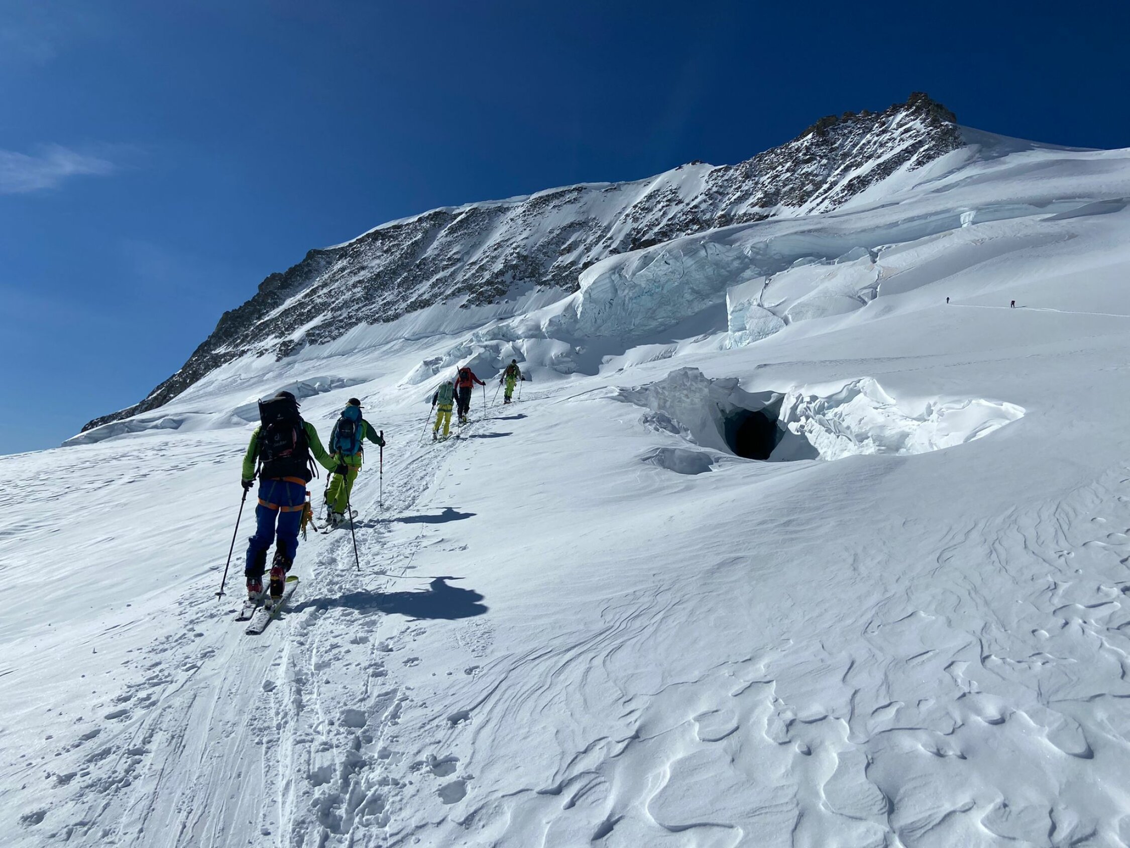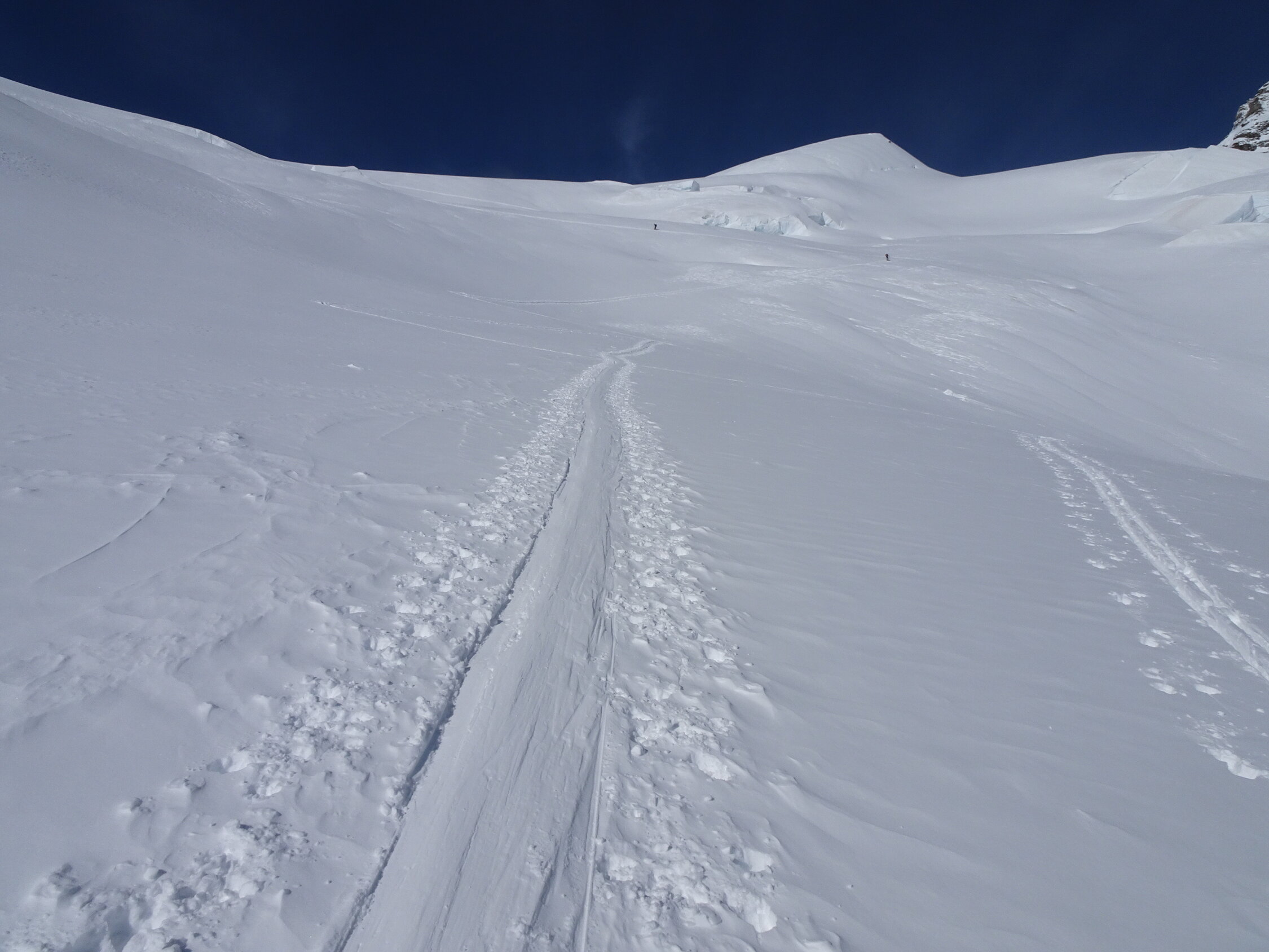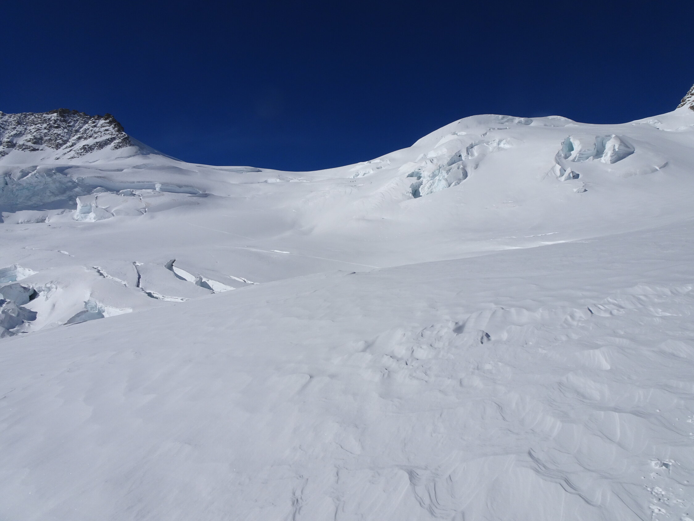 Schnee: ab Jungfraujoch bis zum ersten anfellen Pulver top, Abfahrt über den Kranzbergfirn ebenfalls Pulver aber bereits etwas schwerer, ab Lötschenlücke schwerer Pulver mit abnehmender Höhe dann sogar Sulz(wen wunderts bei diesen warmen Temperaturen), im Aufstieg jeweils sehr gute Spur, Abfahrt noch bis Blatten möglich(sehr nasser Schnee) aber nicht mehr lange ohne die ersten Tragestrecken