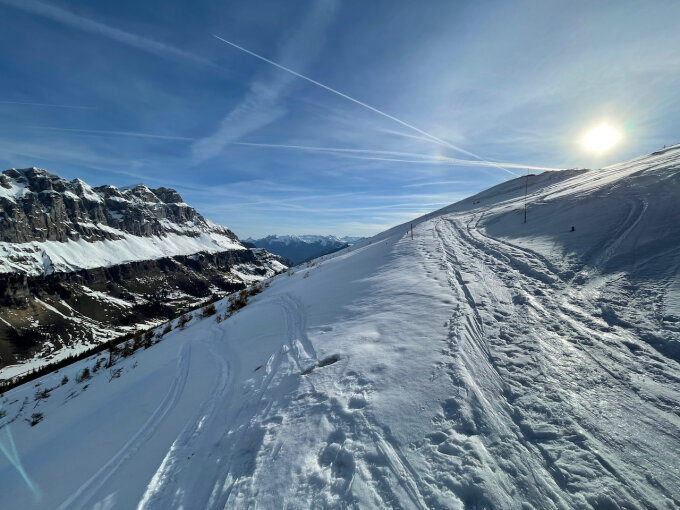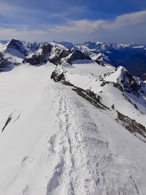 Mehr als ausreichend Schnee auf fast der ganzen Route. Nur in den unteren Kehren der Klausenpass-Straße wurde es eng und dann der letzte Kilometer zurück in die Ortsmitte Urnerboden, wo wir dann die Ski tragen mussten. Die Schneequalität war durchgehend brauchbar mit meist Sulz (unsere Abfahrt vom Chammlijoch um ca. 16:00 Uhr), aber auch überraschenderweise einem Powderhang im ersten Abfahrtsdrittel runter vom Joch. In der Kletterpartie im Clariden-Westgrat griffiger Trittschnee - die Steigeisen blieben im Rücksack. Alle Ketten sind frei.