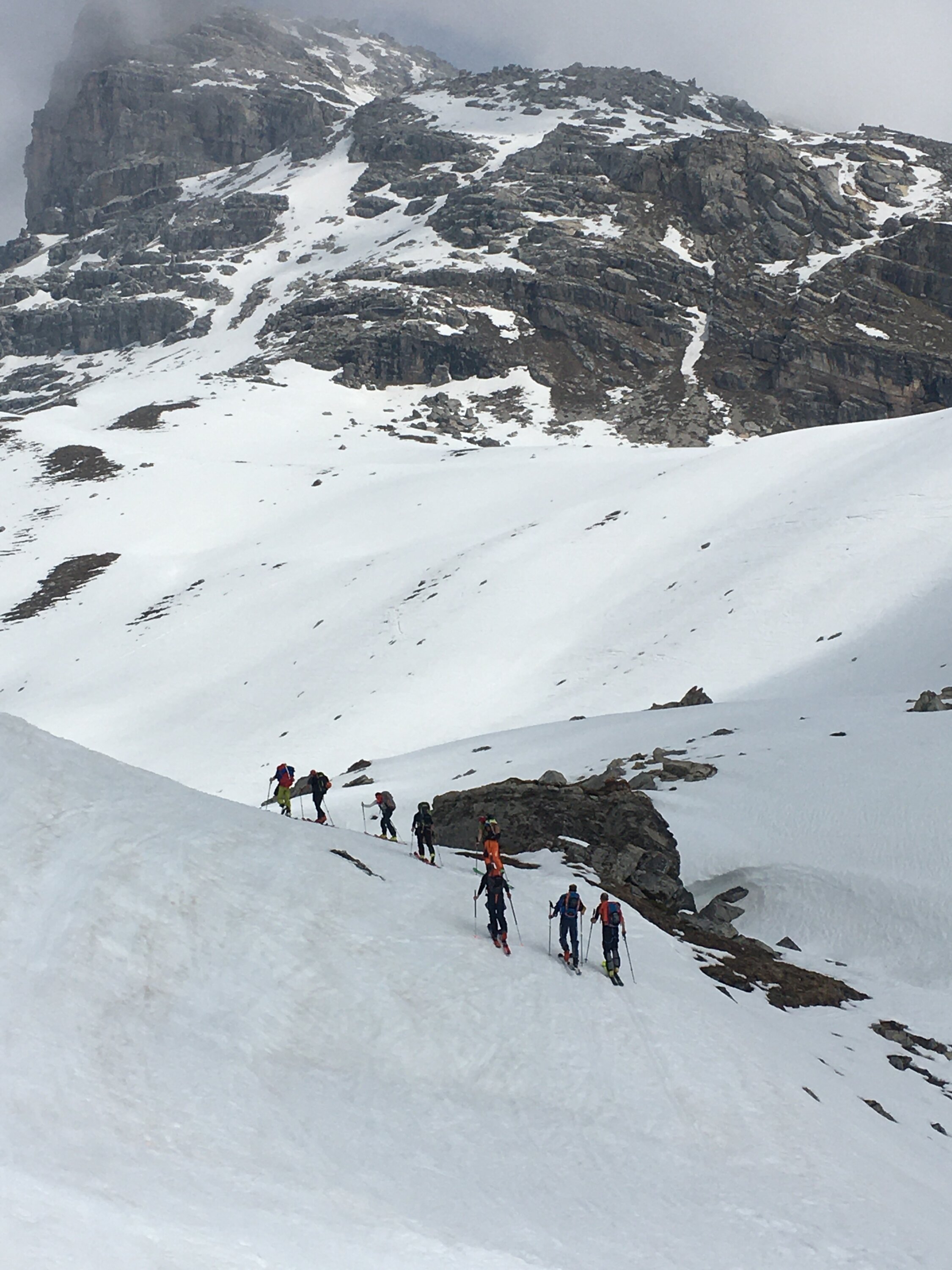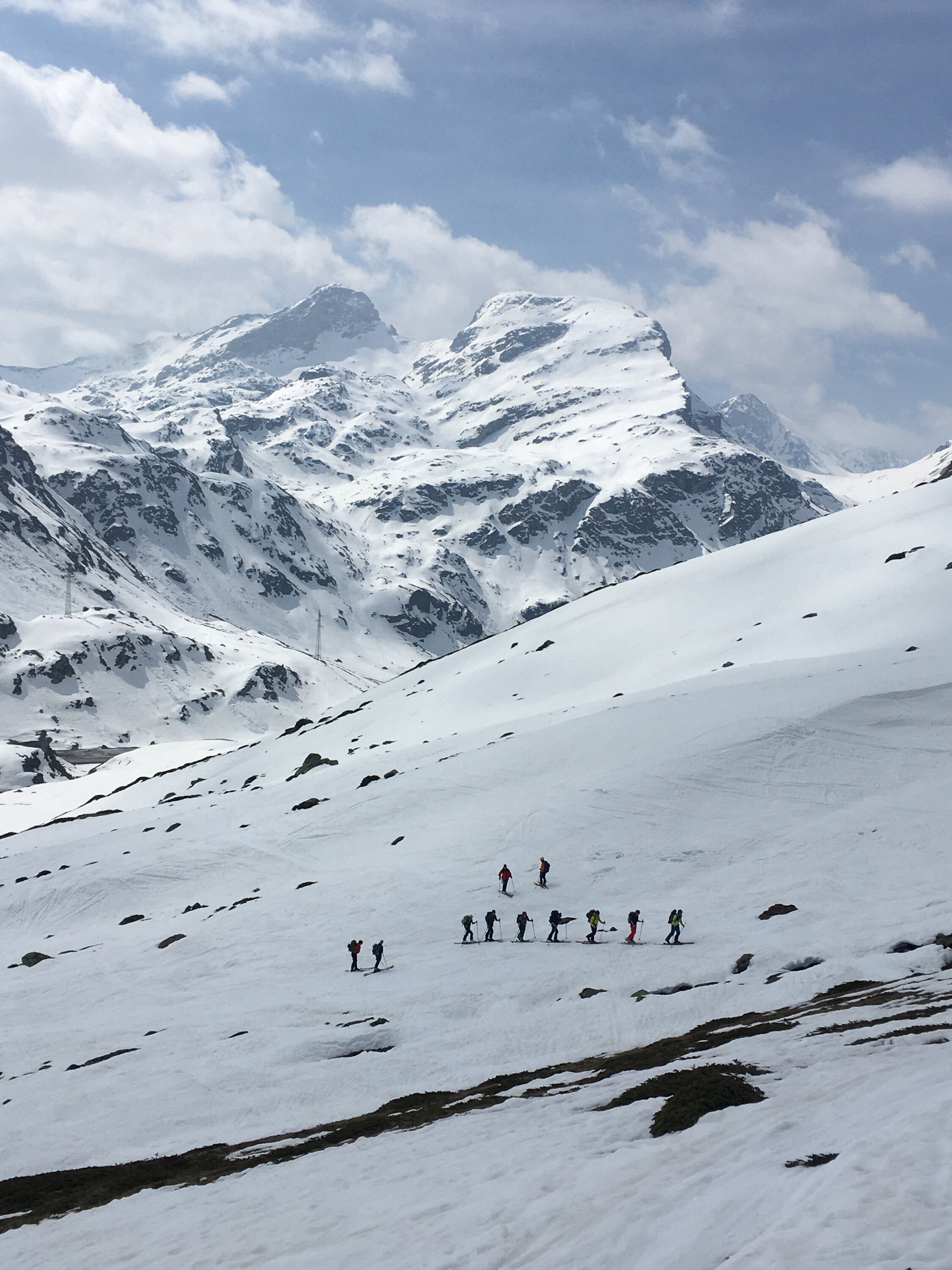 Bin heute mit Lawinenbulletin nicht einverstanden, eher Stufe mässig am Vormittag. Unterhalb Flanke Piz Berdella riesige Nassschneelawine, aber stört nicht für Route. Früh starten, vor 7 Uhr bei diesen Temparaturen, nachts ist es auch nicht kalt.