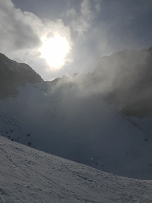 Gut bezieht sich auf den Aufstieg! Start um 7:30 bei La Veduta, Parkplätze schon fast voll. Auf harter Kruste aber immer wieder einbrechend hoch zur Schulter Pkt. 2449. Traverse statt Abfahrt zum See, yours truly entspannter mit Harscheisen. Aufgrund von zuziehender Bewölkung/Nebel waren wir mehrmals nahe dran abzubrechen. Nach einigen Pausen schien sich die Sonne doch endlich durchzusetzen und wir sind weiter. Rel. gute Spur bis zum Sattel Pkt. 2803, mit Harscheisen komfortabler. Danach unschwierig bei schönem Sonnenschein zum Gipfel (welcher sich immer hinter noch einem Aufschwung zu verstecken schien.)