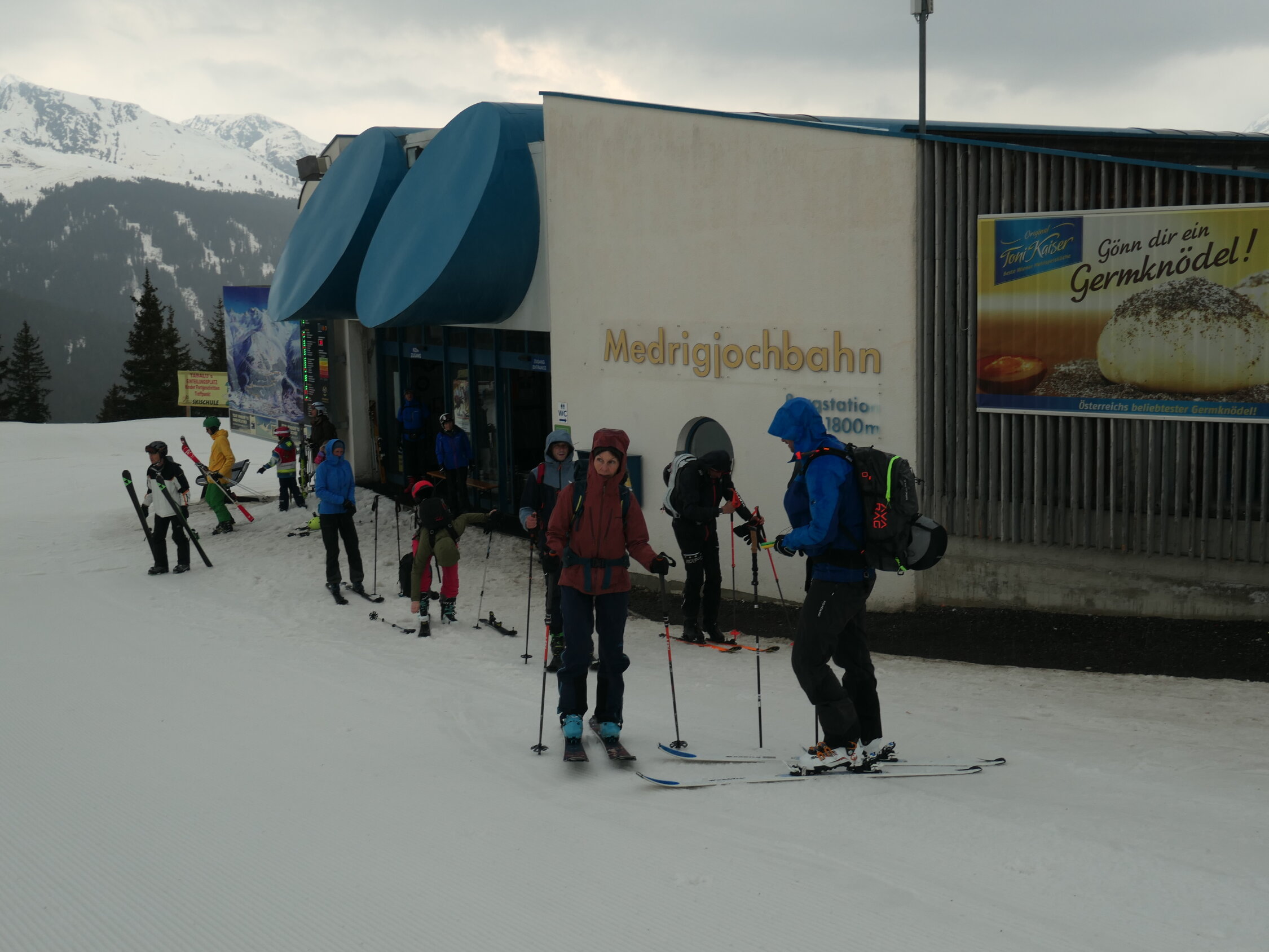 Zustieg über die Ascherhütte Mit der Bergbahn von SEE/Paznauntal zum Medrigschicenter. Von dort über die Schipiste zur Talstation der Versingbahn. Im freien Schigelände bzw. über die Schiroute Aufstieg bis zur Bergstation der Versingbahn. Von dort über meist vorhandene Aufstiegsspur in die Kübelgrubenscharte.