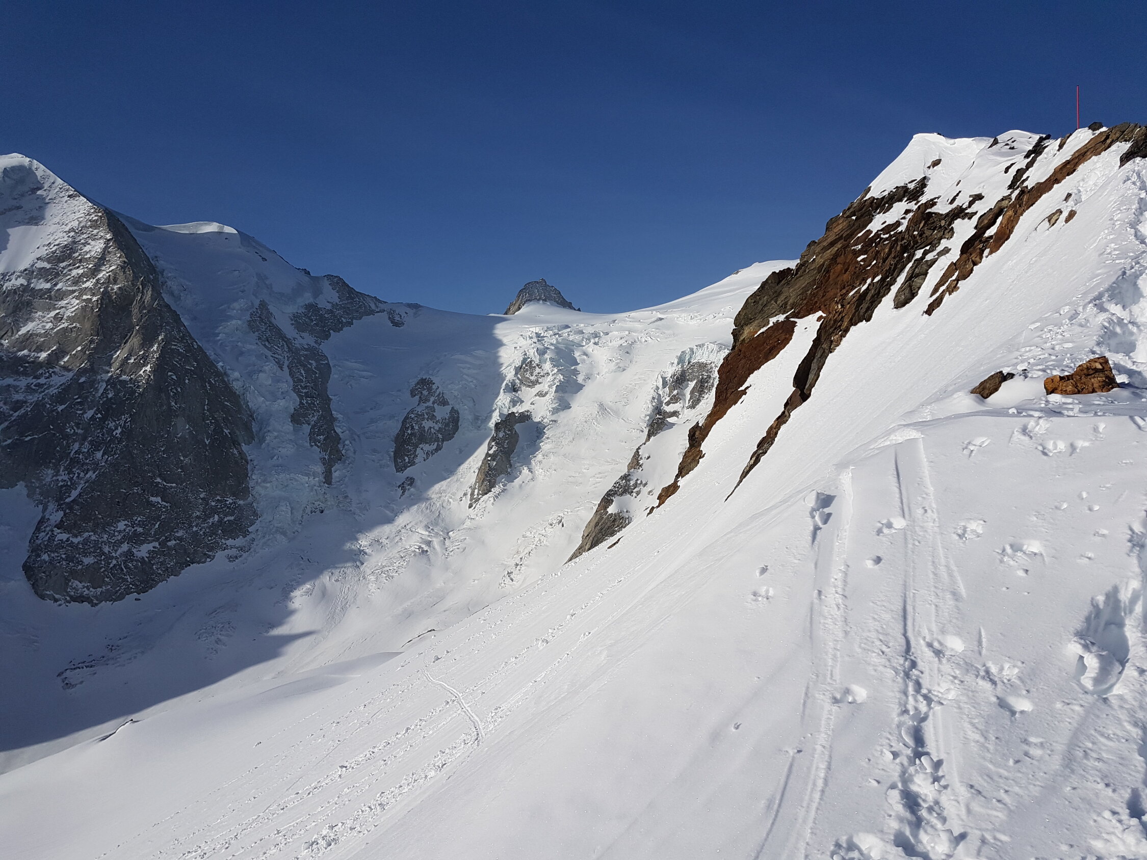 Von der Oberaletschhütte kamen auch 2 zum Breithorn, ebenso 2 zum Nesthorn, obwohl es recht blank aussieht. Wegen grosser Wühlerei sind wir nur zum Ostgipfel. (keine Spur zum Hauptgipfel erkennbar). Strasse Fafleralp bis Blatten immer noch grösstenteils schneebedeckt.